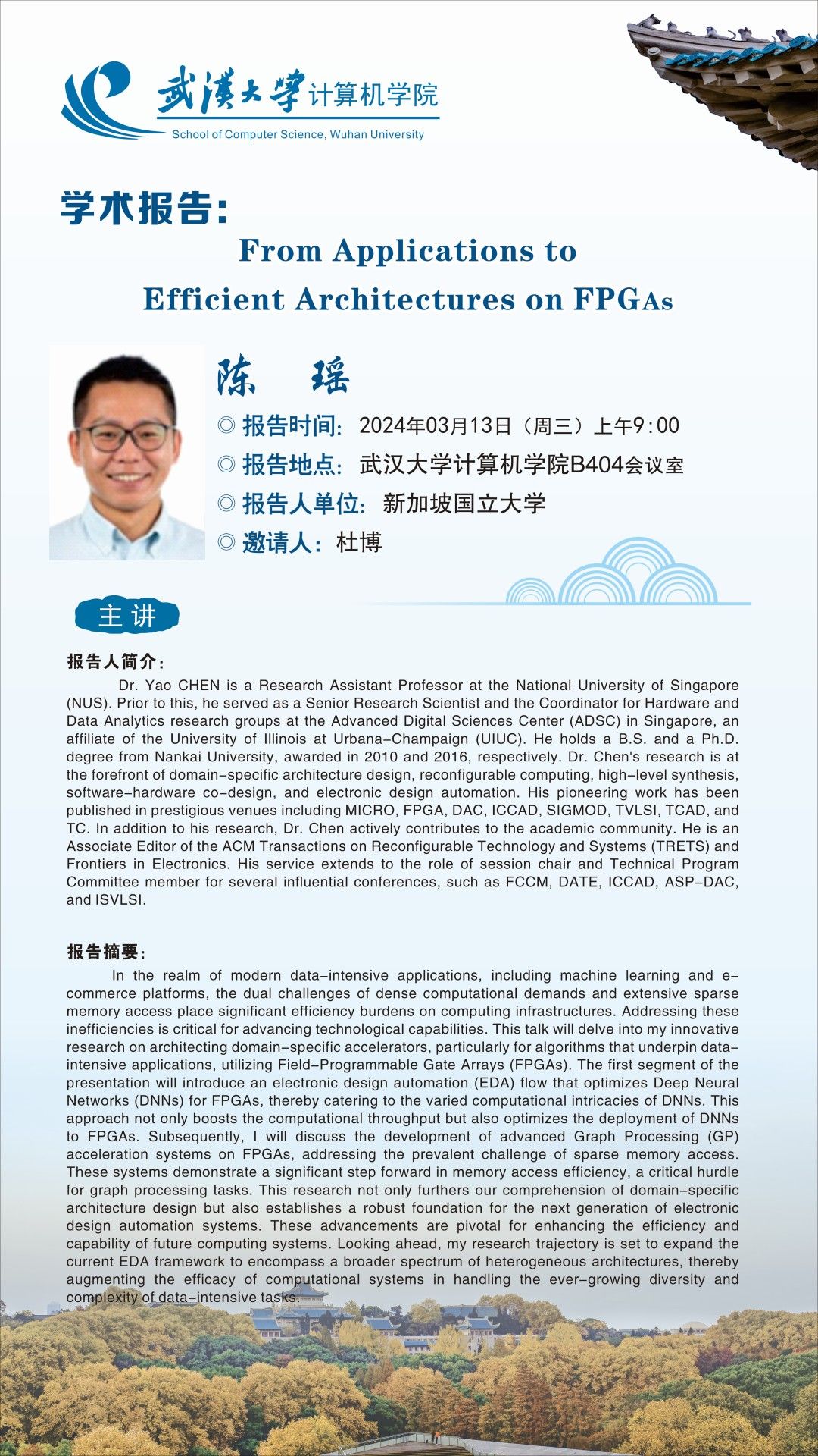 报告人简介: Dr. Yao CHEN is a Research Assistant Professor at the National University of Singapore (NUS). Prior to this, he served as a Senior Research Scientist and the Coordinator for Hardware and Data Analytics research groups at the Advanced Digital Sciences Center (ADSC) in Singapore, an affiliate of the University of Illinois at Urbana-Champaign (UIUC). He holds a B.S. and a Ph.D. degree from Nankai University, awarded in 2010 and 2016, respectively. Dr. Chen's research is at the forefront of domain-specific architecture design, reconfigurable computing, high-level synthesis, software-hardware co-design, and electronic design automation. His pioneering work has been published in prestigious venues including MICRO, FPGA, DAC, ICCAD, SIGMOD, TVLSI, TCAD, and TC. In addition to his research, Dr. Chen actively contributes to the academic community. He is an Associate Editor of the ACM Transactions on Reconfigurable Technology and Systems (TRETS) and Frontiers in Electronics. His service extends to the role of session chair and Technical Program Committee member for several influential conferences, such as FCCM, DATE, ICCAD, ASP-DAC, and ISVLSI.