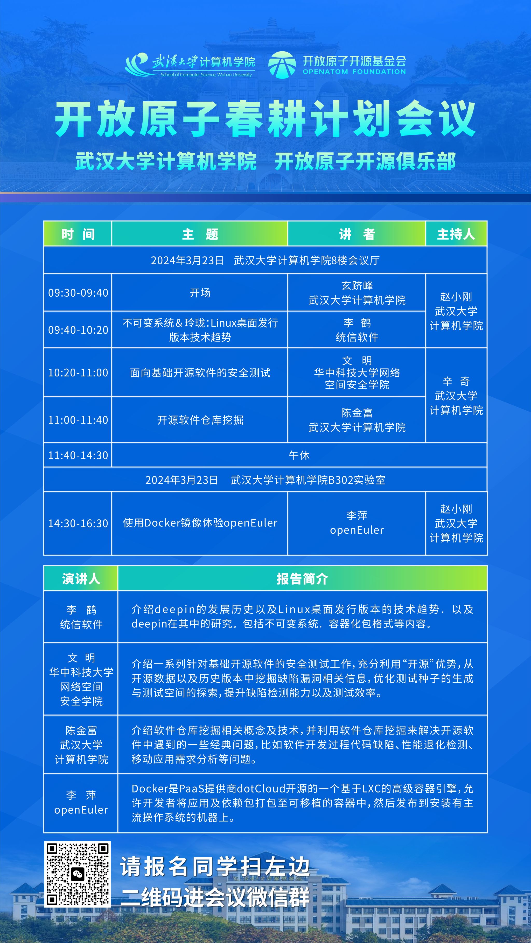 2024年3月23日(周六),学院将举办“开放原子春耕计划”活动,来自统信软件、华中科技大学、openEuler和Avidol