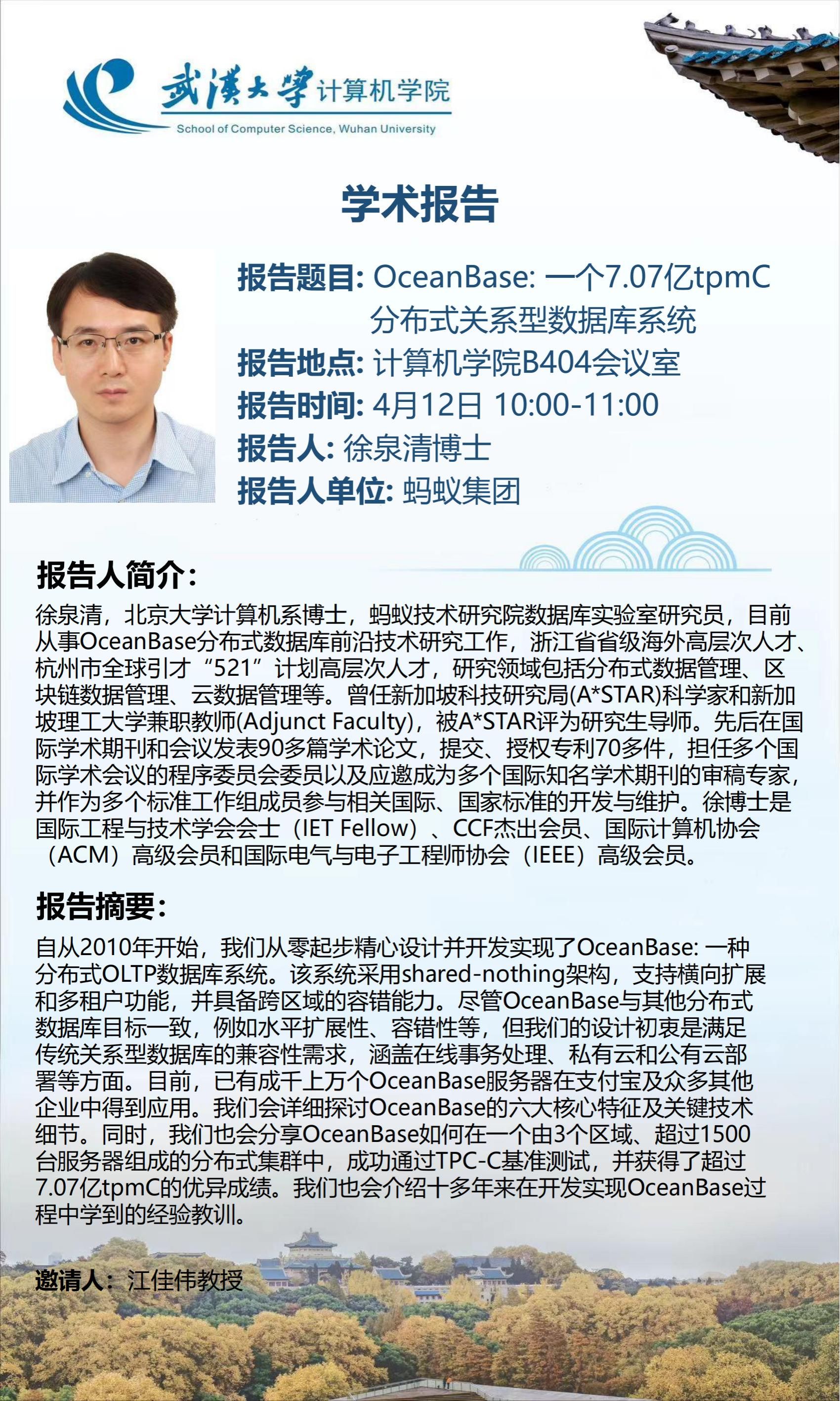 报告人简介:徐泉清,北京大学计算机系博士,蚂蚁技术研究院数据库实验室研究员,目前从事OceanBase分布式数据库前沿技术研究工作,浙江省省级海外高层次人才、杭州市全球引才“521”计划高层次人才。研究领域包括分布式数据管理、区块链数据管理、云数据管理等。曾任新加坡科技研究局(A*STAR)科学家和新加坡理工大学兼职教师(Adjunct Faculty),被A*STAR评为研究生导师。先后在国际学术期刊和会议发表90多篇学术论文,提交、授权专利70多件,担任多个国际学术会议的程序委员会委员以及应邀成为多个国际知名学术期刊的审稿专家,并作为多个标准工作组成员参与相关国际、国家标准的开发与维护。徐博士是国际工程与技术学会会士(IET Fellow)、CCF杰出会员、国际计算机协会(ACM)高级会员和国际电气与电子工程师协会(IEEE)高级会员。