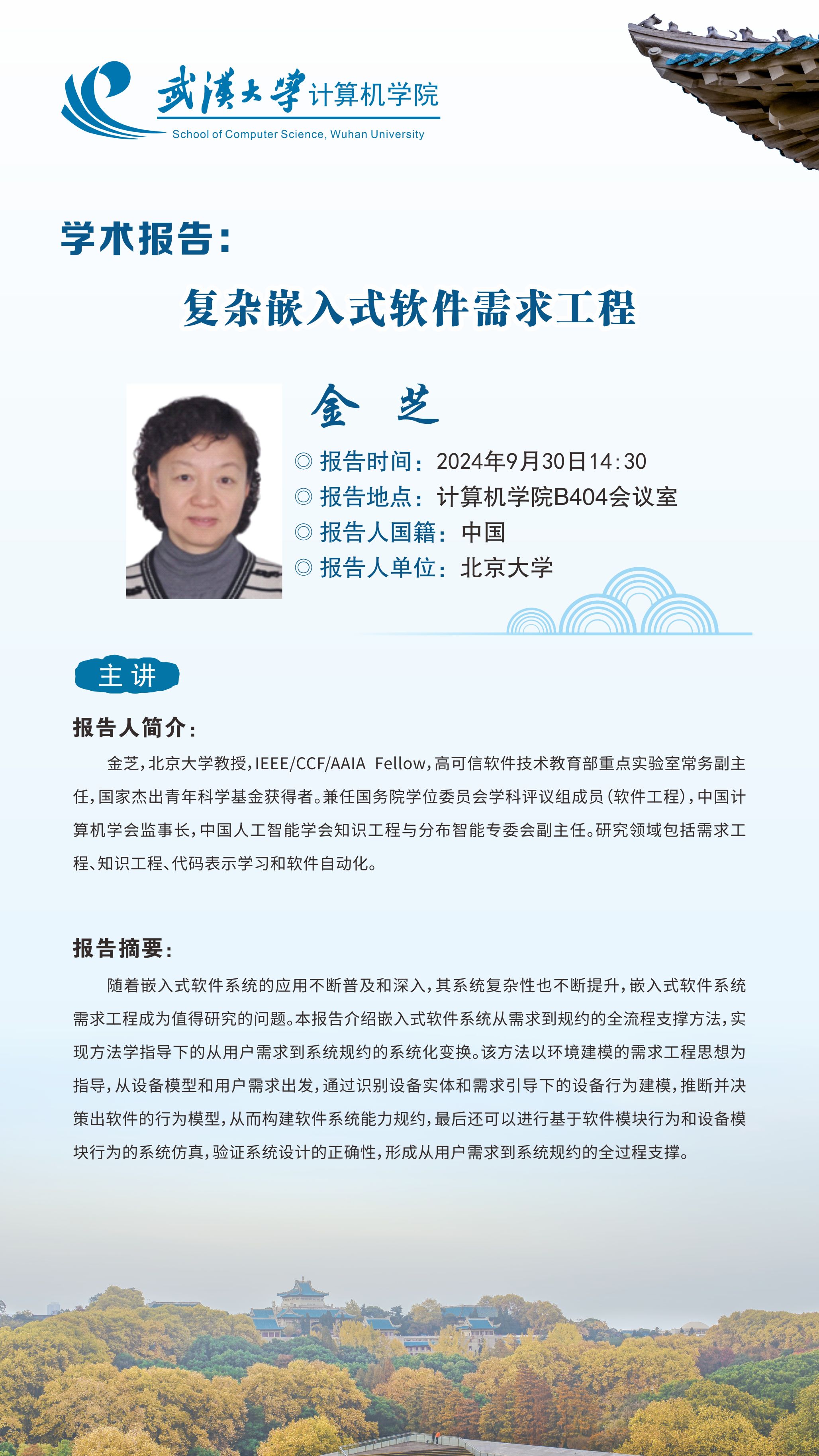 报告人简介:金芝,北京大学教授,IEEE/CCF/AAIA Fellow,高可信软件技术教育部重点实验室常务副主任,国家杰出青年科学基金获得者。兼任国务院学位委员会学科评议组成员(软件工程),中国计算机学会监事长,中国人工智能学会知识工程与分布智能专委会副主任。研究领域包括需求工程、知识工程、代码表示学习和软件自动化。