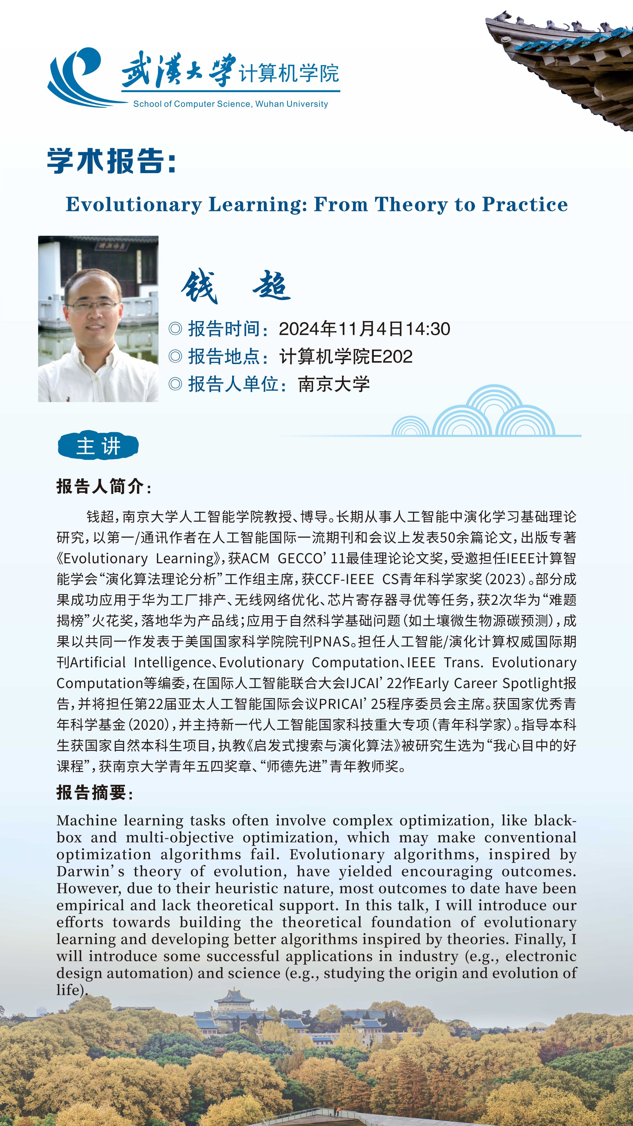 报告人简介:钱超,南京大学人工智能学院教授、博导。长期从事人工智能中演化学习基础理论研究,以第一/通讯作者在人工智能国际一流期刊和会议上发表50余篇论文,出版专著《Evolutionary Learning》,获ACM GECCO’11最佳理论论文奖,受邀担任IEEE计算智能学会“演化算法理论分析”工作组主席,获CCF-IEEE CS青年科学家奖(2023)。部分成果成功应用于华为工厂排产、无线网络优化、芯片寄存器寻优等任务,获2次华为“难题揭榜”火花奖,落地华为产品线;应用于自然科学基础问题(如土壤微生物源碳预测),成果以共同一作发表于美国国家科学院院刊PNAS。担任人工智能/演化计算权威国际期刊Artificial Intelligence、Evolutionary Computation、IEEE Trans. Evolutionary Computation等编委,在国际人工智能联合大会IJCAI’22作Early Career Spotlight报告,并将担任第22届亚太人工智能国际会议PRICAI’25程序委员会主席。获国家优秀青年科学基金(2020),并主持新一代人工智能国家科技重大专项(青年科学家)。指导本科生获国家自然本科生项目,执教《启发式搜索与演化算法》被研究生选为“我心目中的好课程”,获南京大学青年五四奖章、“师德先进”青年教师奖。
