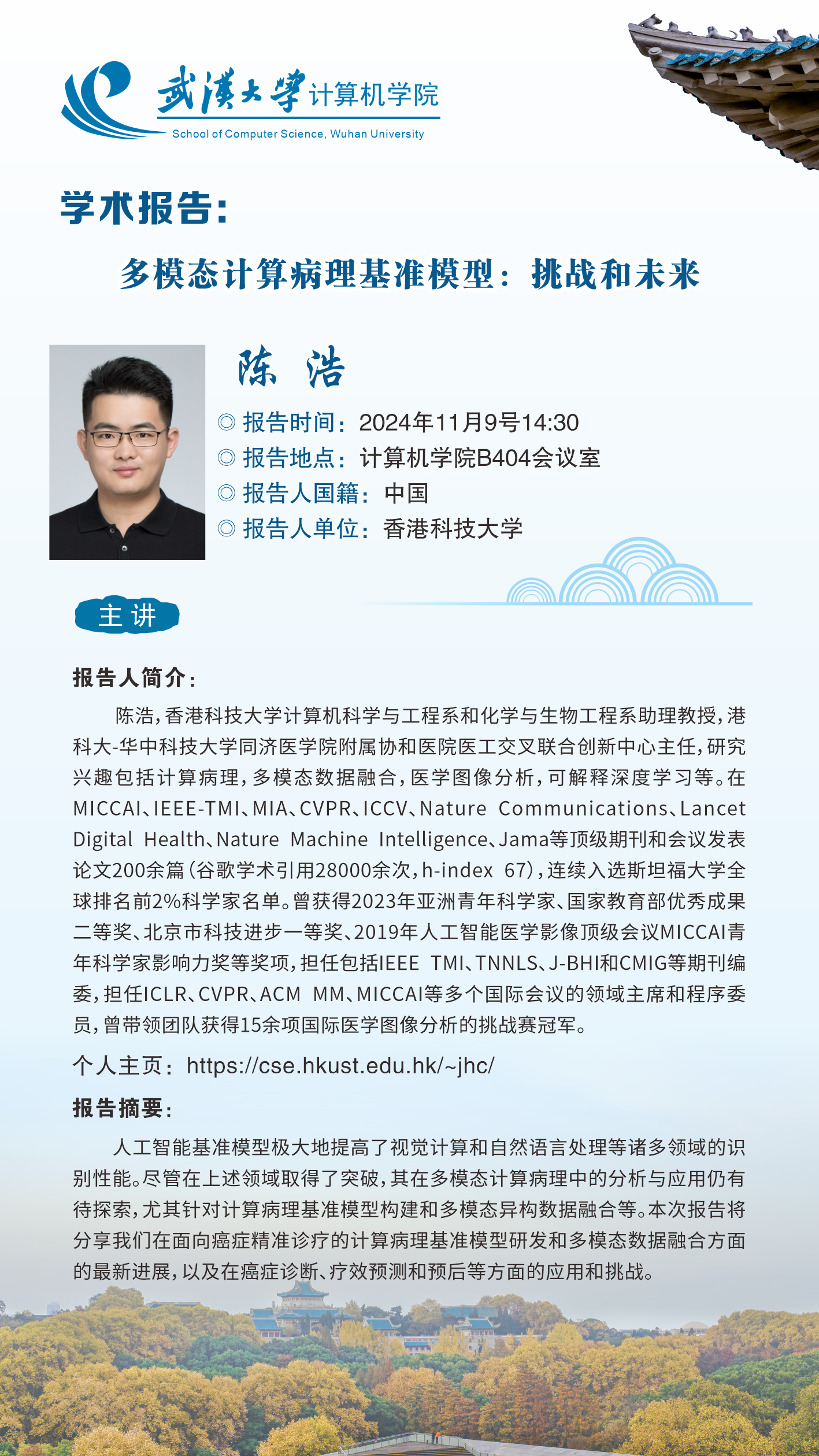 报告人简介:陈浩,香港科技大学计算机科学与工程系和化学与生物工程系助理教授,港科大-华中科技大学同济医学院附属协和医院医工交叉联合创新中心主任,研究兴趣包括计算病理,多模态数据融合,医学图像分析,可解释深度学习等。在MICCAI、IEEE-TMI、MIA、CVPR、ICCV、Nature Communications、Lancet Digital Health、Nature Machine Intelligence、Jama等顶级期刊和会议发表论文200余篇(谷歌学术引用28000余次,h-index 67),连续入选斯坦福大学全球排名前2%科学家名单。曾获得2023年亚洲青年科学家、国家教育部优秀成果二等奖、北京市科技进步一等奖、2019年人工智能医学影像顶级会议MICCAI青年科学家影响力奖等奖项,担任包括IEEE TMI、TNNLS、J-BHI和CMIG等期刊编委,担任ICLR、CVPR、ACM MM、MICCAI等多个国际会议的领域主席和程序委员,曾带领团队获得15余项国际医学图像分析的挑战赛冠军。