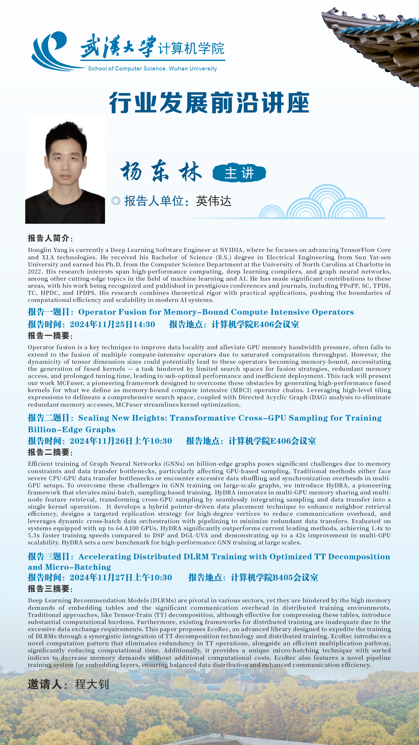 报告人简介:Donglin Yang is currently a Deep Learning Software Engineer at NVIDIA, where he focuses on advancing TensorFlow Core and XLA technologies. He received his Bachelor of Science (B.S.) degree in Electrical Engineering from Sun Yat-sen University and earned his Ph.D. from the Computer Science Department at the University of North Carolina at Charlotte in 2022. His research interests span high-performance computing, deep learning compilers, and graph neural networks, among other cutting-edge topics in the field of machine learning and AI. He has made significant contributions to these areas, with his work being recognized and published in prestigious conferences and journals, including PPoPP, SC, TPDS, TC, HPDC, and IPDPS. His research combines theoretical rigor with practical applications, pushing the boundaries of computational efficiency and scalability in modern AI systems.