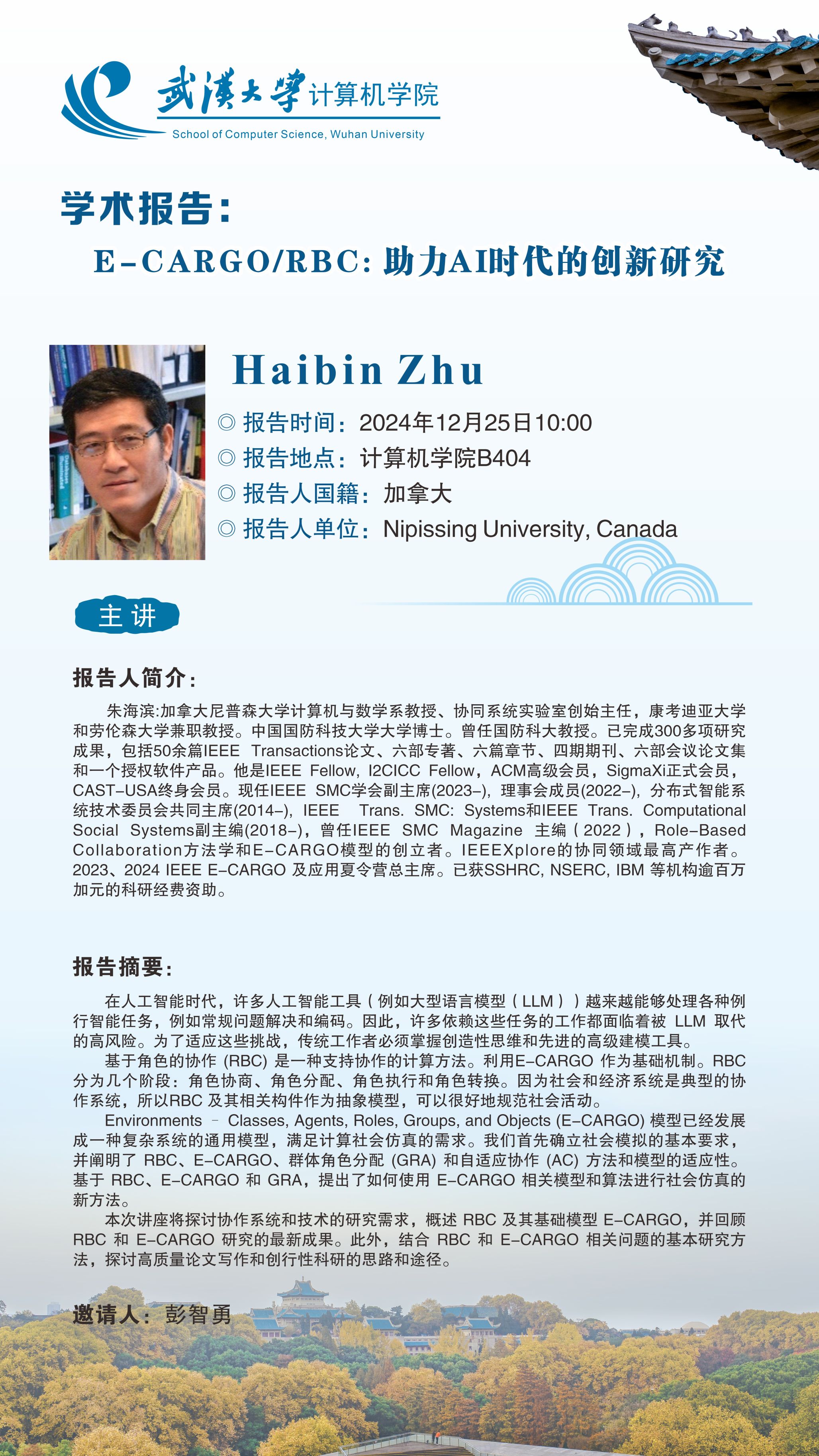 报告人简介:朱海滨:加拿大尼普森大学计算机与数学系教授、协同系统实验室创始主任,康考迪亚大学和劳伦森大学兼职教授。中国国防科技大学博士。曾任国防科大教授。已完成300多项研究成果,包括50余篇IEEE Transactions论文、六部专著、六篇章节、四期期刊、六部会议论文集和一个授权软件产品。他是IEEE Fellow, I2CICC Fellow,ACM高级会员,SigmaXi正式会员,CAST-USA终身会员。现任IEEE SMC学会副主席(2023-), 理事会成员(2022-), 分布式智能系统技术委员会共同主席(2014-), IEEE Trans. SMC: Systems和IEEE Trans. Computational Social Systems副主编(2018-),曾任IEEE SMC Magazine 主编(2022),Role-Based Collaboration方法学和E-CARGO模型的创立者。IEEEXplore的协同领域最高产作者。2023、2024 IEEE E-CARGO 及应用夏令营总主席。已获SSHRC, NSERC, IBM 等机构逾百万加元的科研经费资助。