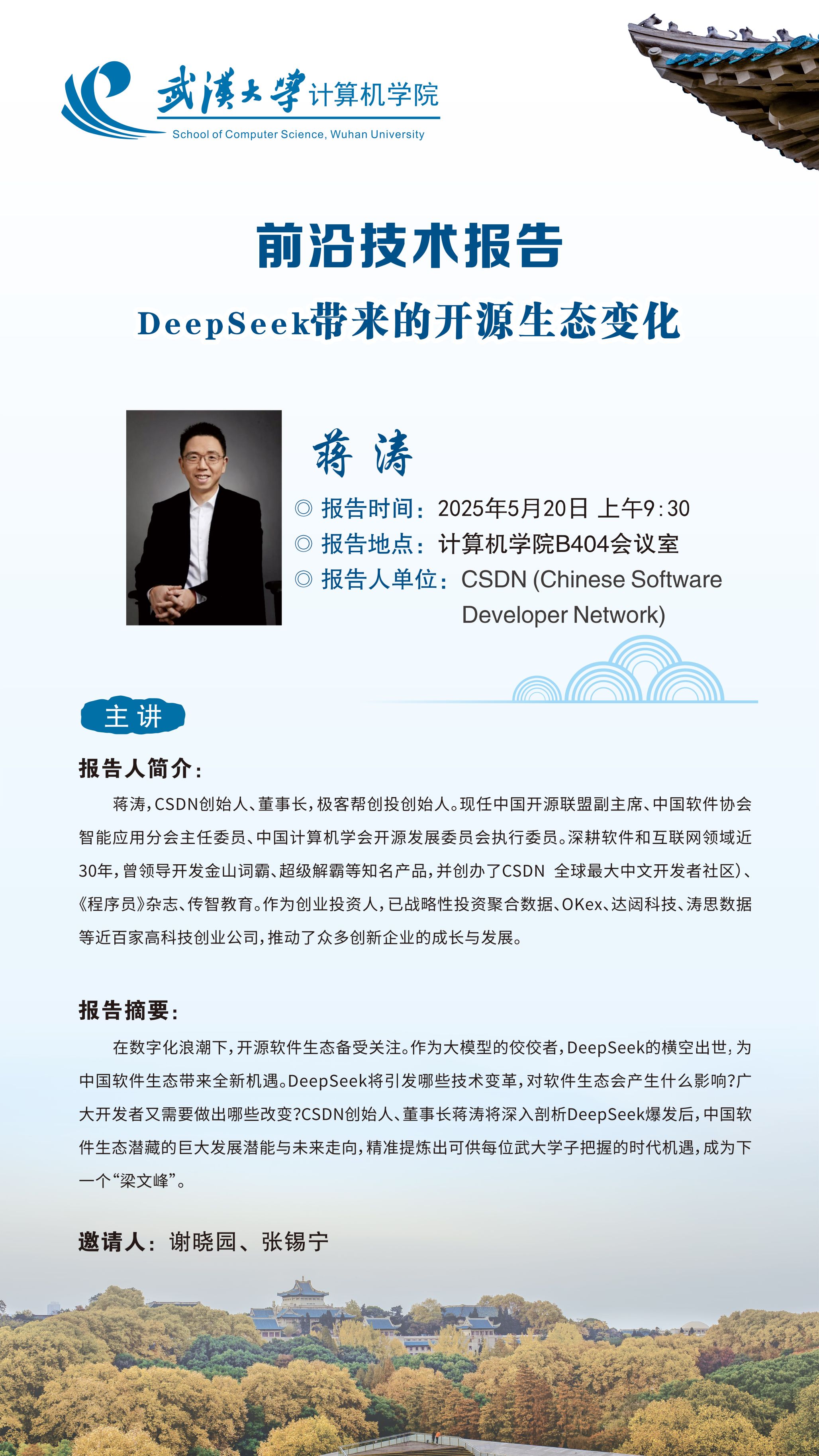 报告摘要:在数字化浪潮下,开源软件生态备受关注。作为大模型的佼佼者,DeepSeek的横空出世,为中国软件生态带来全新机遇。DeepSeek将引发哪些技术变革,对软件生态会产生什么影响?广大开发者又需要做出哪些改变?CSDN创始人、董事长蒋涛将深入剖析DeepSeek爆发后,中国软件生态潜藏的巨大发展潜能与未来走向,精准提炼出可供每位武大学子把握的时代机遇,成为下一个“梁文峰”。