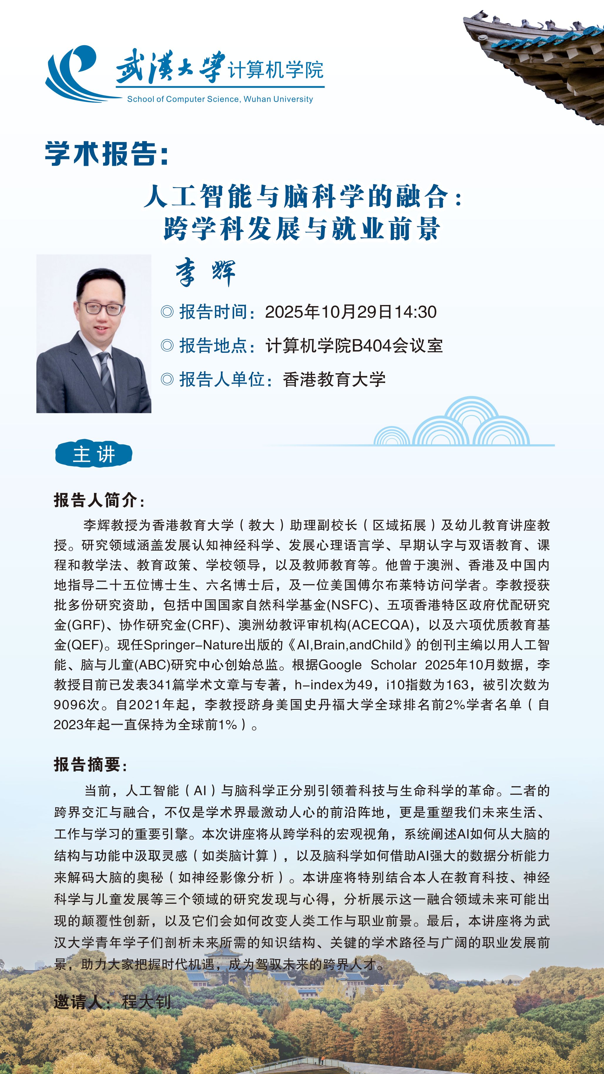 报告人简介:李辉教授为香港教育大学(教大)助理副校长(区域拓展)及幼儿教育讲座教授。研究领域涵盖发展认知神经科学、发展心理语言学、早期认字与双语教育、课程和教学法、教育政策、学校领导,以及教师教育等。他曾于澳洲、香港及中国内地指导二十五位博士生、六名博士后,及一位美国傅尔布莱特访问学者。李教授获批多份研究资助,包括中国国家自然科学基金(NSFC)、五项香港特区政府优配研究金(GRF)、协作研究金(CRF)、澳洲幼教评审机构(ACECQA),以及六项优质教育基金(QEF)。现任Springer-Nature出版的《AI, Brain, and Child》的创刊主编以用人工智能、脑与儿童(ABC)研究中心创始总监。根据Google Scholar 2025年10月数据,李教授目前已发表341篇学术文章与专著,h-index为49,i10指数为163,被引次数为9096次。自2021年起,李教授跻身美国史丹福大学全球排名前2%学者名单(自2023年起一直保持为全球前1%)。