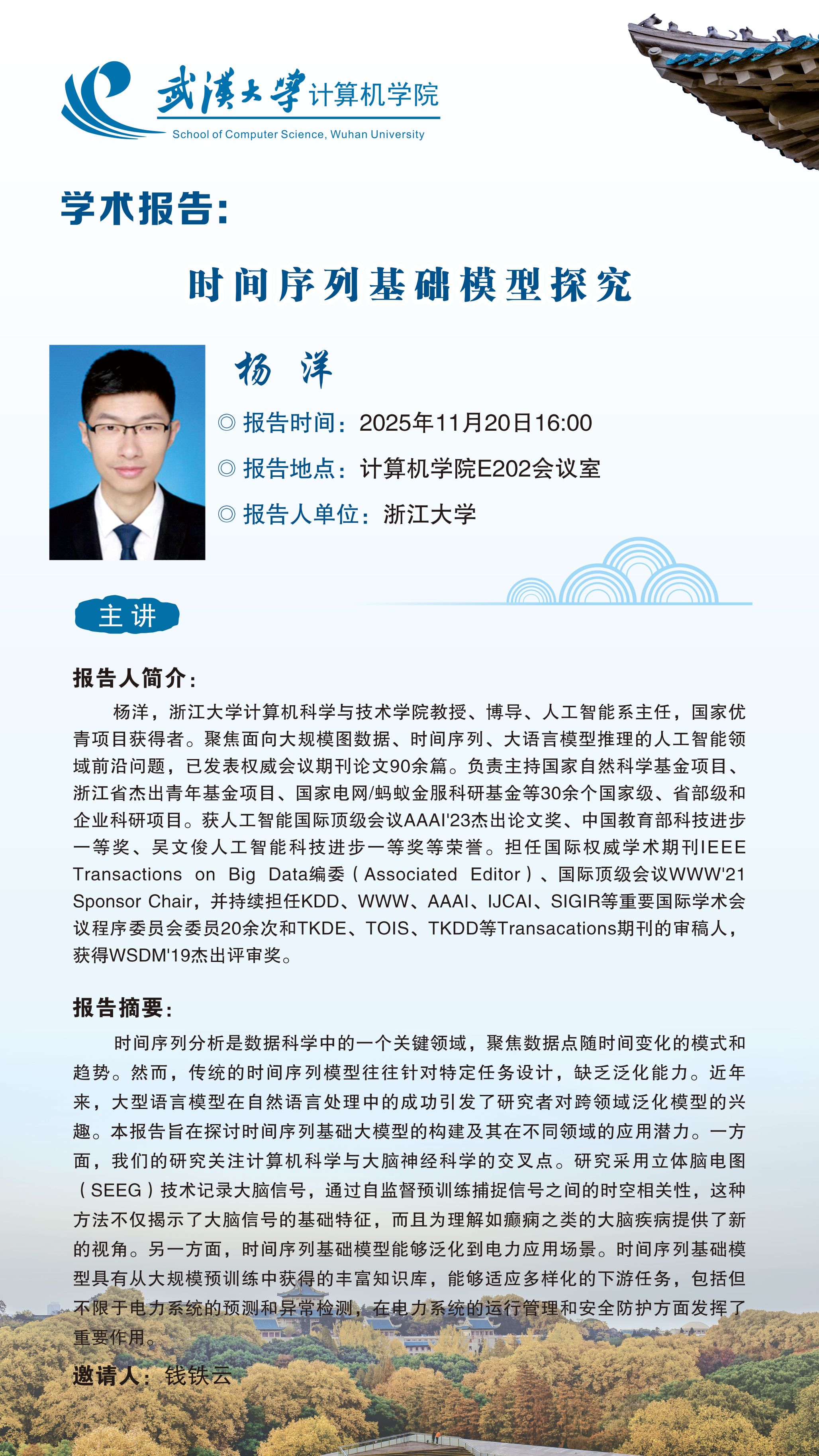 报告人简介:杨洋,浙江大学计算机科学与技术学院教授、博导、人工智能系主任,国家优青项目获得者。聚焦面向大规模图数据、时间序列、大语言模型推理的人工智能领域前沿问题,已发表权威会议期刊论文90余篇。负责主持国家自然科学基金项目、浙江省杰出青年基金项目、国家电网/蚂蚁金服科研基金等30余个国家级、省部级和企业科研项目。获人工智能国际顶级会议AAAI'23杰出论文奖、中国教育部科技进步一等奖、吴文俊人工智能科技进步一等奖等荣誉。担任国际权威学术期刊IEEE Transactions on Big Data编委(Associated Editor)、国际顶级会议WWW'21 Sponsor Chair,并持续担任KDD、WWW、AAAI、IJCAI、SIGIR等重要国际学术会议程序委员会委员20余次和TKDE、TOIS、TKDD等Transacations期刊的审稿人,获得WSDM'19杰出评审奖。