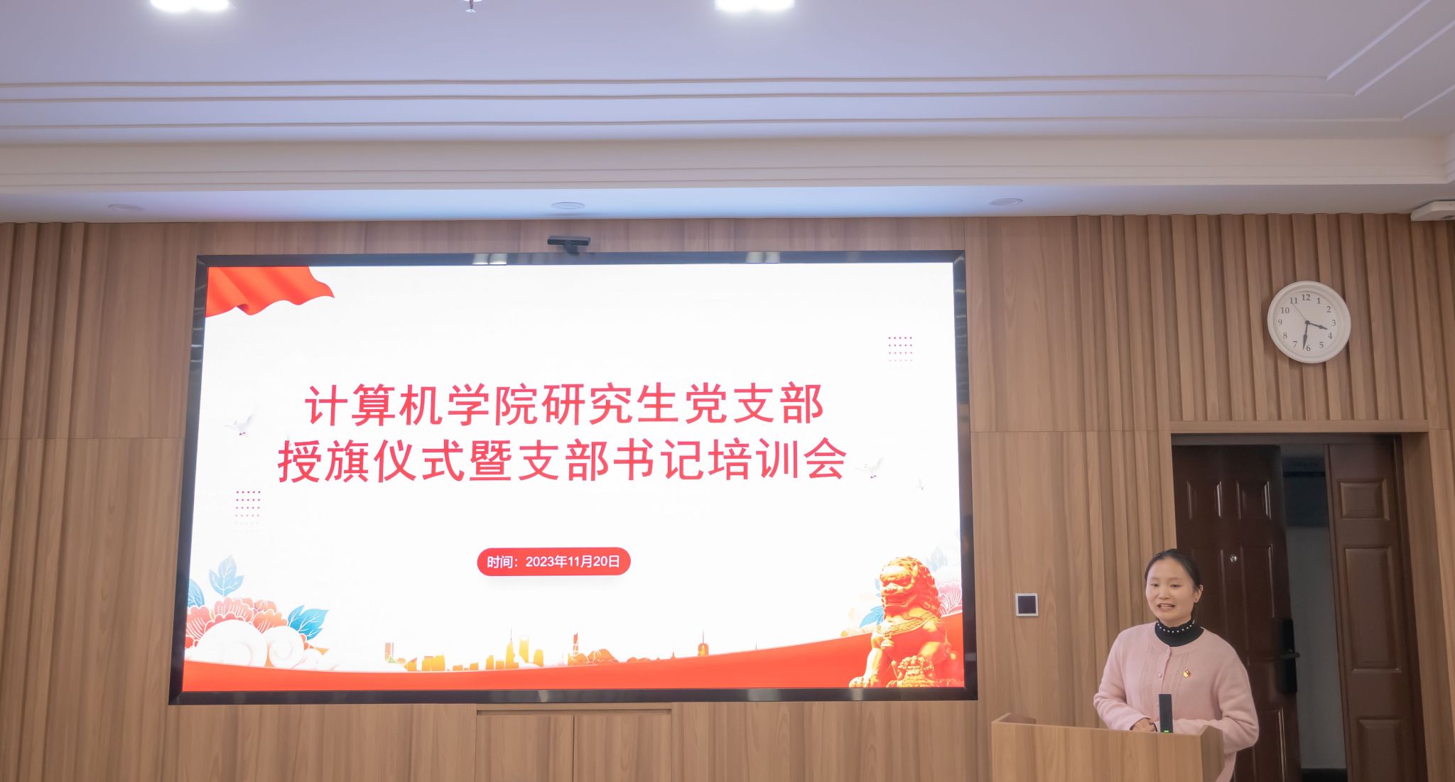 研究生党支部授旗仪式暨支部书记培训会于学院B404会议室举行。学院党委书记边金鸾、党委副书记高卫松、纪委书记杨晓岚、研究生党支部新任党建导师、研究生办公室主任潘艳、研究生辅导员史然及各研究生党支部书记出席本次活动。仪式由学院研究生党总支书记于雅梦老师主持。