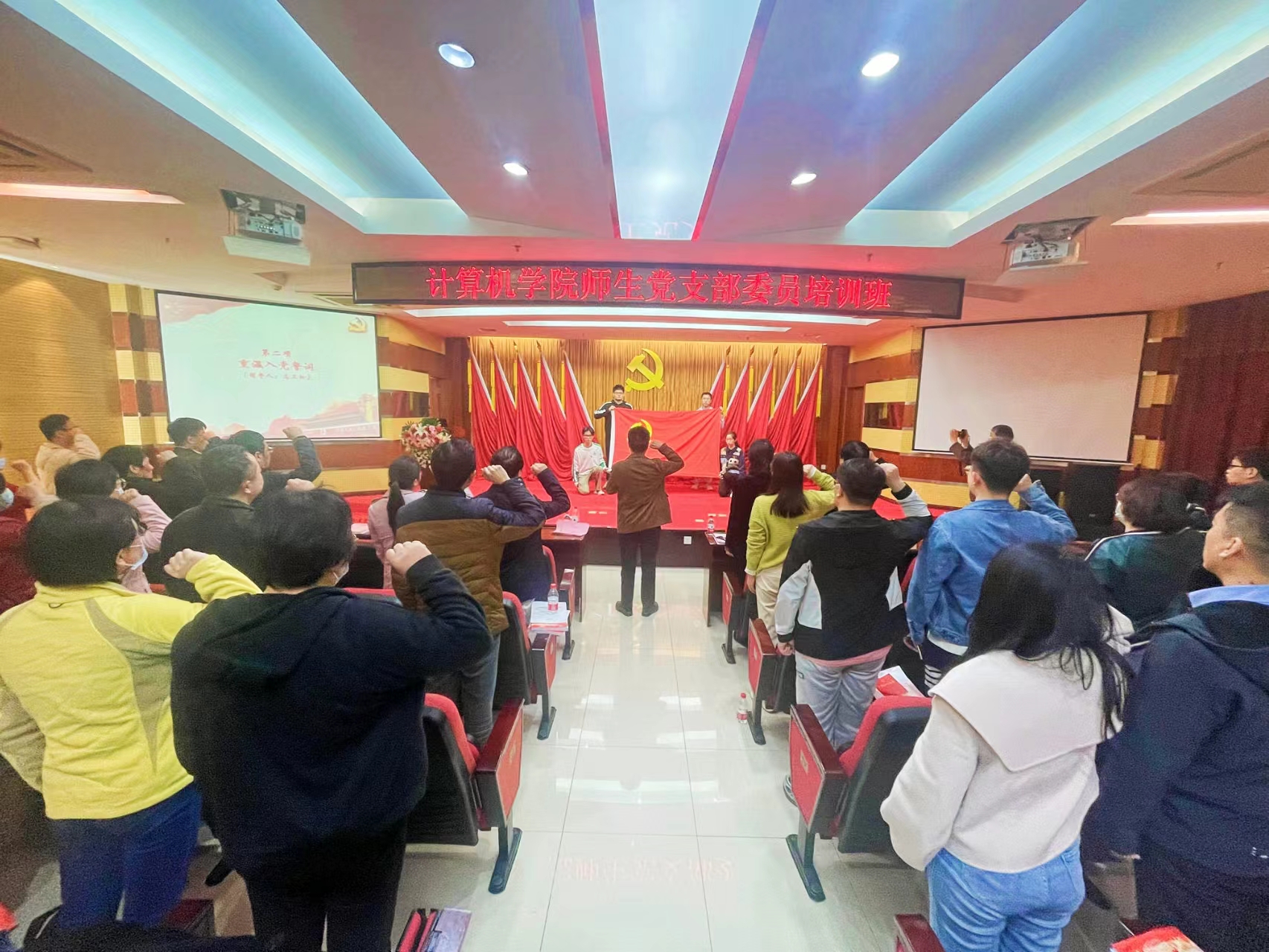 仪式在庄严的国歌中拉开了序幕。鲜红的党旗下,领誓员带领全体委员,庄严地举起右手,握拳面向党旗重温入党誓词。