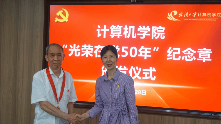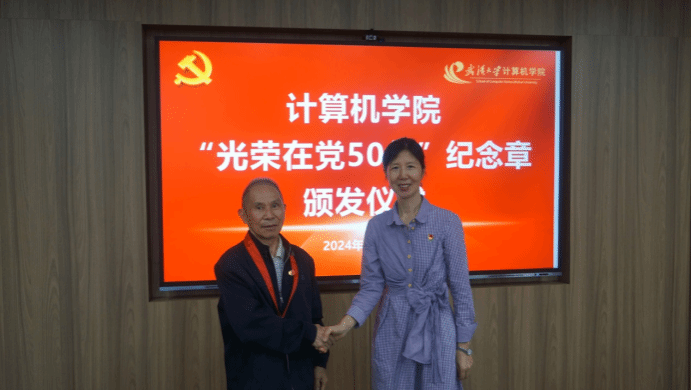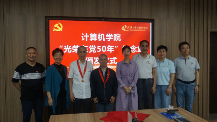 杨晓岚介绍了院党委今年“光荣在党50年”纪念章人员统计审核过程。边书记为学院两位老党员林子禹、徐贵钢老师颁发了“光荣在党50年”纪念章,高卫松副书记为纪念章获得者发放了慰问金,并合影留念。