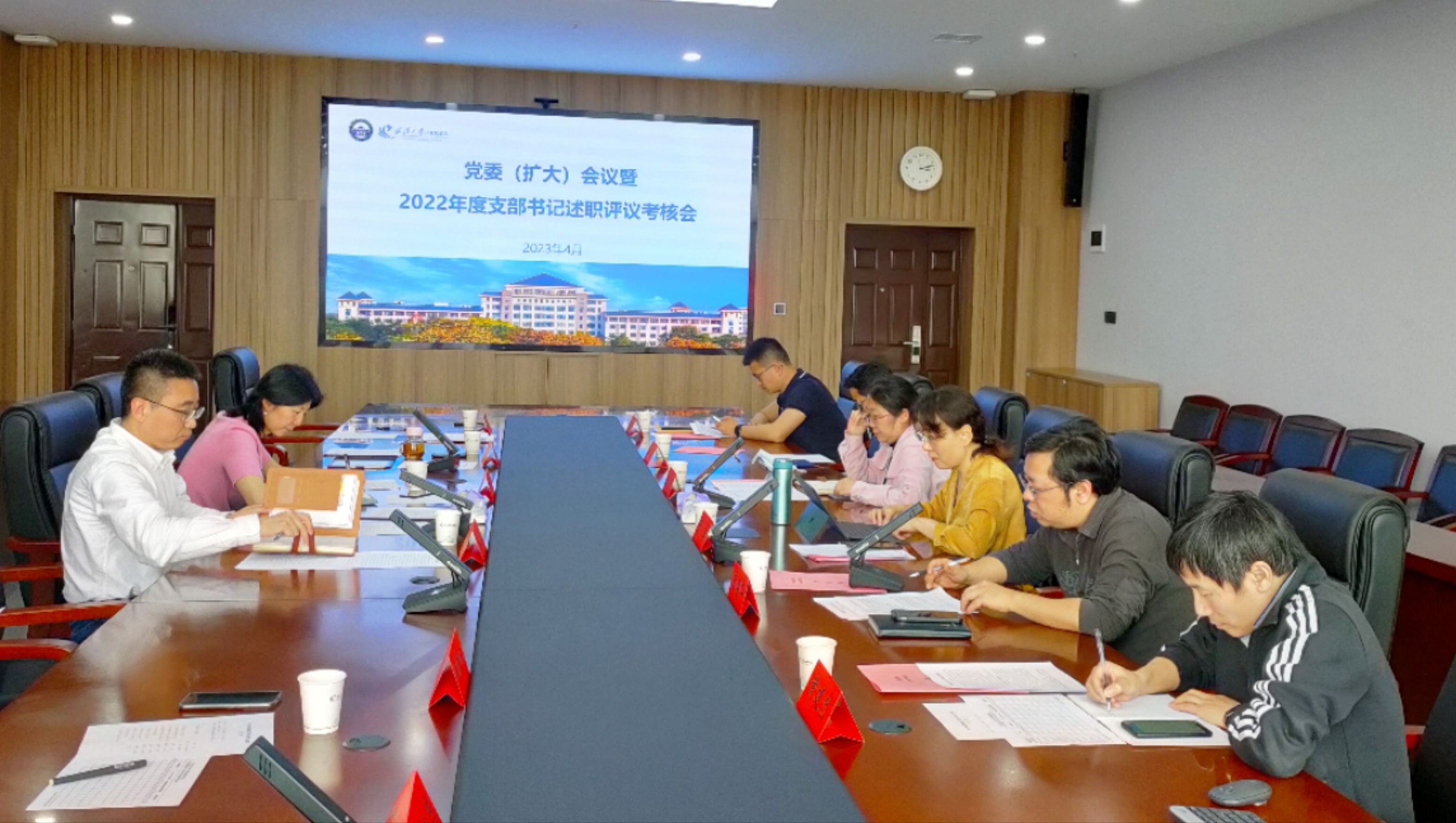 4月12日下午,学院党委在院B405会议室召开了党委扩大会暨2022年度教职工党支部书记述职评议考核会。院党委委员、系、中心、室主任、离退休党支部书记等教工党员代表参加了会议。党委副书记高卫松主持会议。