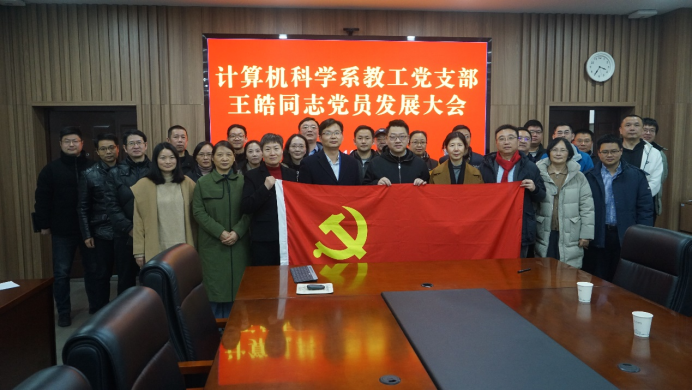 2024年12月12日下午,计算机科学系教工党支部召开党员发展大会,讨论接收王皓同志为中共预备党员,会议由支部书记黄浩同志主持,校党委组织部副部长刘义胜、学院党委书记边金鸾、党委副书记高卫松、纪委书记杨晓岚、计算机科学系教工党支部全体党员参加大会。