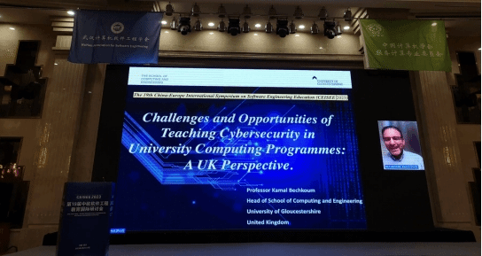 Kamal Bechkoum教授的报告题目为“Challenges and Opportunities of Teaching Cybersecurity in University Computing Programmes: A UK Perspective”,介绍了网络安全教育的发展,以及它为主流高等教育带来的挑战和机遇,并介绍了网络安全教学的各种专业和认证标准方面的作用和价值,以及学校与英国国家网络安全中心(NCSC)的合作经验。