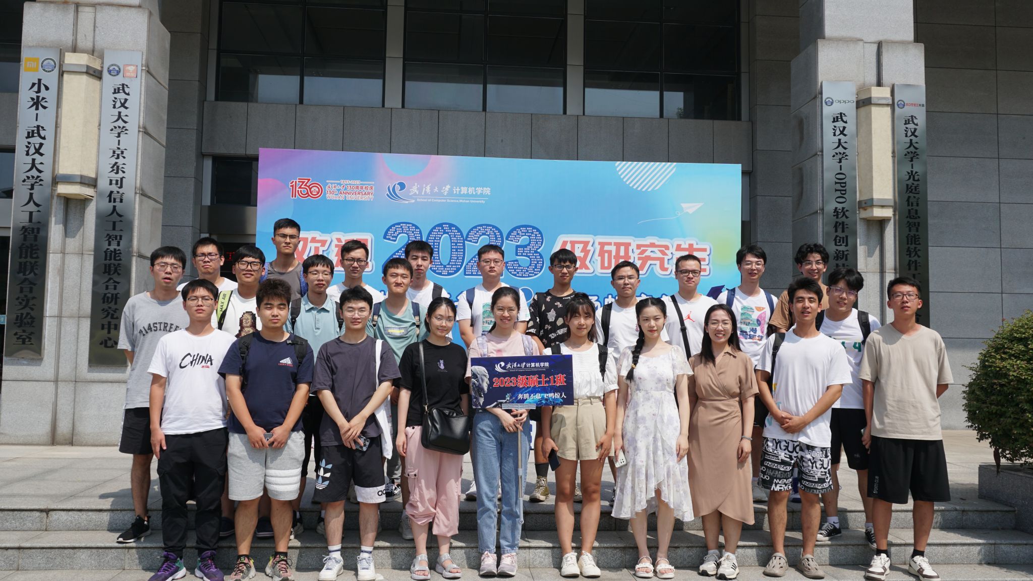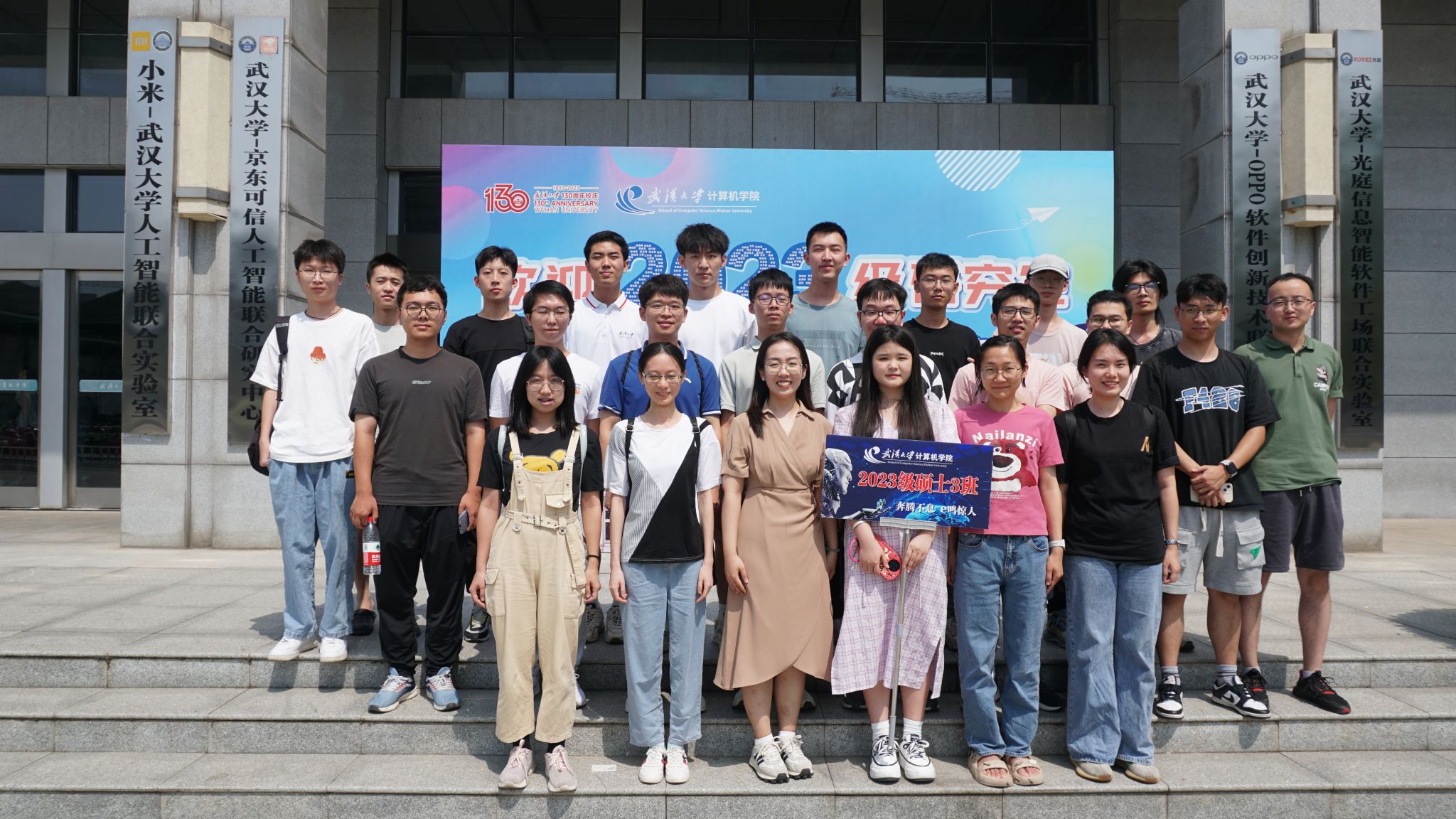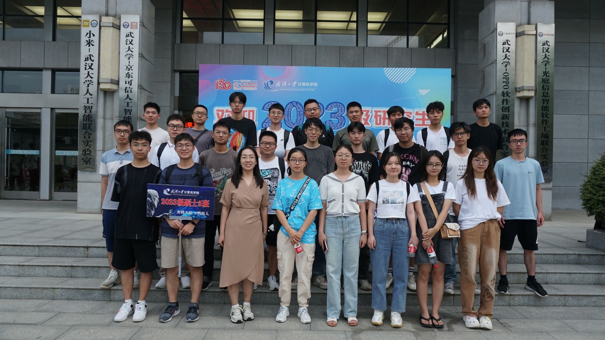 9月10日当天,研究生新生还以班级为单位,利用报告间隙与辅导员史然老师一起前往写有2023级全体研究生姓名的迎新喷绘前,拍摄了入学第一张班级合影,并召开了入学第一场新生班级见面会。