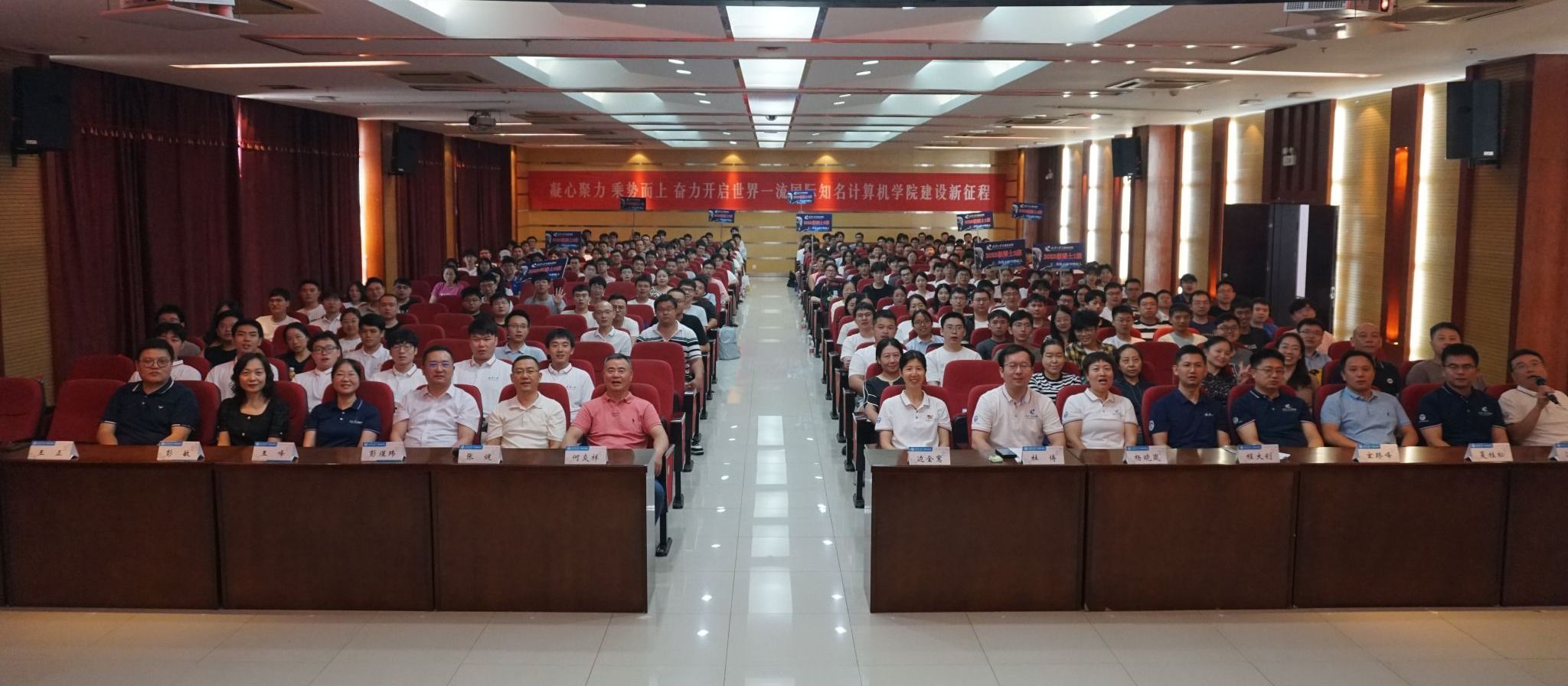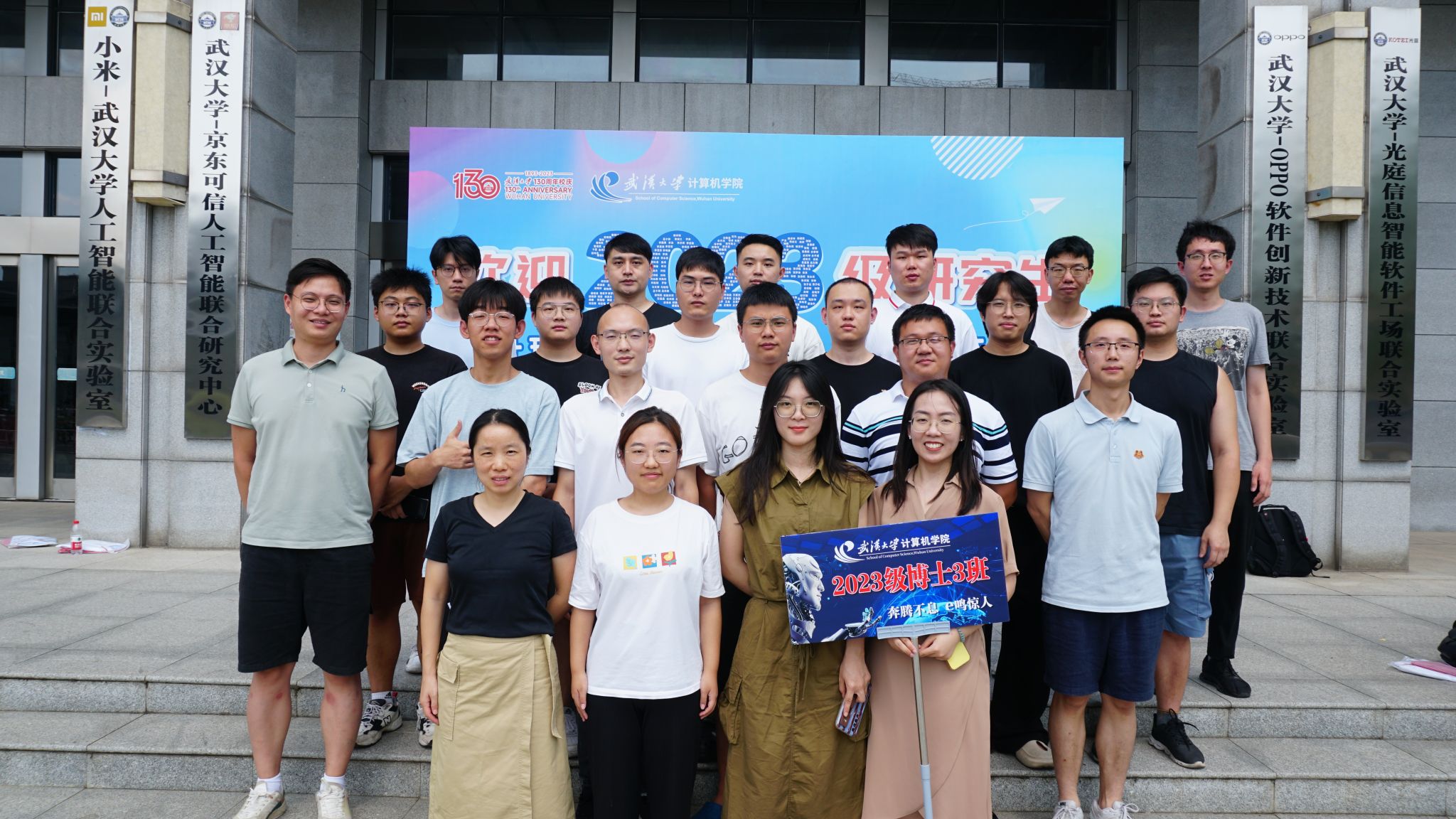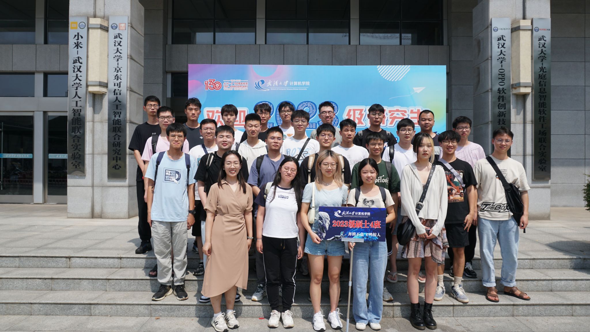 9月10日当天,研究生新生还以班级为单位,利用报告间隙与辅导员史然老师一起前往写有2023级全体研究生姓名的迎新喷绘前,拍摄了入学第一张班级合影,并召开了入学第一场新生班级见面会。