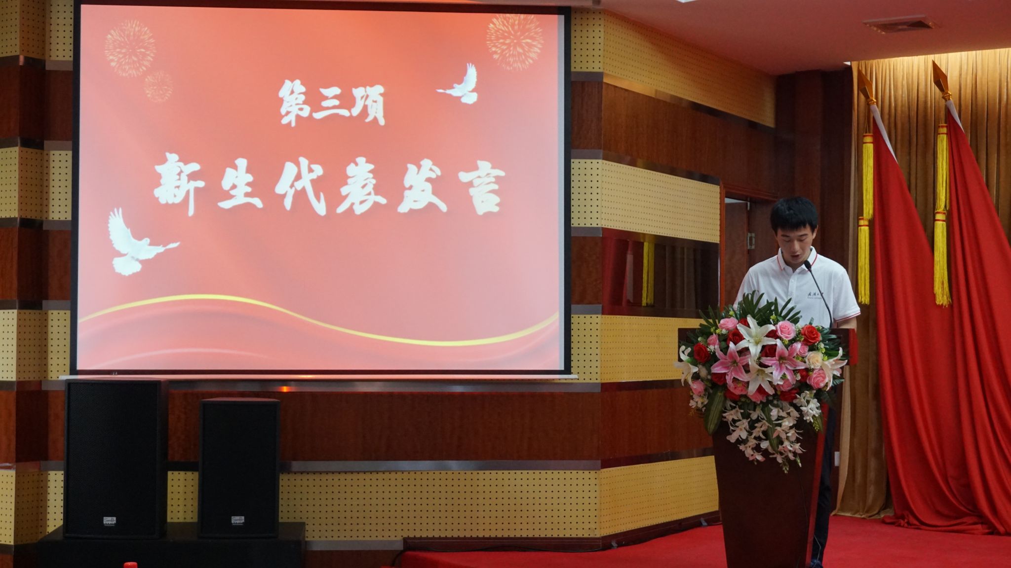 一朝沐杏雨,一生念师恩。正值第39个教师节,新生代表张宏宇、孙威、杨为涛、陈政宇、廖书楠、周卓手捧鲜花走上舞台,为导师献上了祝福的献花、真挚的问候与崇高的敬意,全场同学在温馨的氛围中齐声共祝老师们节日快乐。