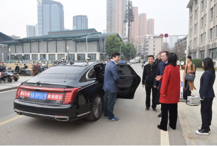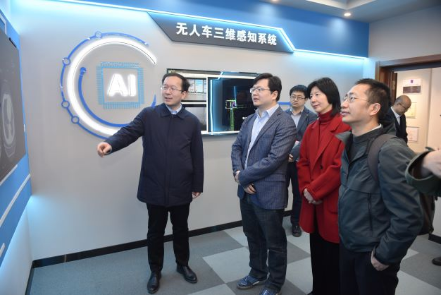 大楼前观看无人驾驶系统的演示,并前往国家多媒体软件工程技术研究中心参观三维音频实验室以及成果展示室,并进行双方交流座谈。