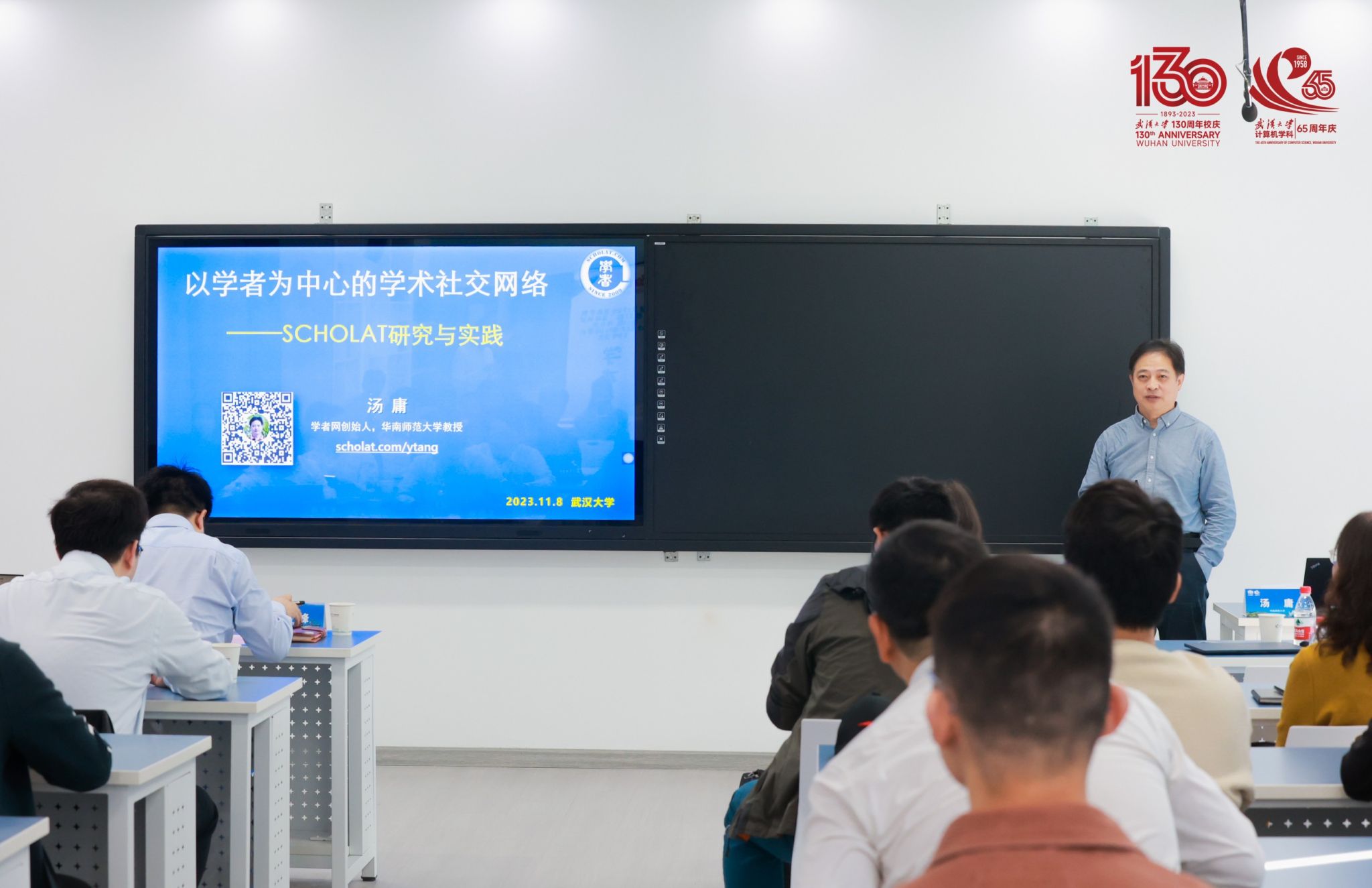 建校130周年回到母校并借此机会领略母校风采感到无比欣慰和自豪。汤教授为大家带来了“以学者为中心的学术社交网络”的学术报告。汤教授介绍了学术社交的需求背景与学术社交的需求特点,结合实例深入浅出地介绍了SCHOLAT内核,并对学者网大数据和学者知识图谱构建展开分析讨论,最后分享了如机构号服务和学者百科等几个SCHOLAT+应用的成果。