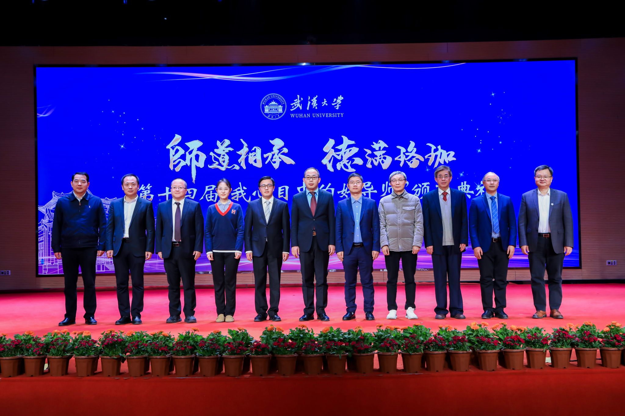 颁奖典礼的最后,张平文校长在讲话中真情回顾了自己过去获评十佳导师的经历,他强调,研究生导师要在为党育人、为国育才的使命任务中接力传承。站在历史的新方位,张平文校长对广大导师提出三点希望:胸怀“国之大者”,做强国建设的笃行者;接续砥砺奋斗,做时代新人的锻造者;练就过硬本领,做一流武大的建设者,并号召广大学生学习传承各位“好导师”的治学精神和优良作风,以“功成不必在我”的情怀和“功成必定有我”的担当,磨砺真本领,书写新篇章。