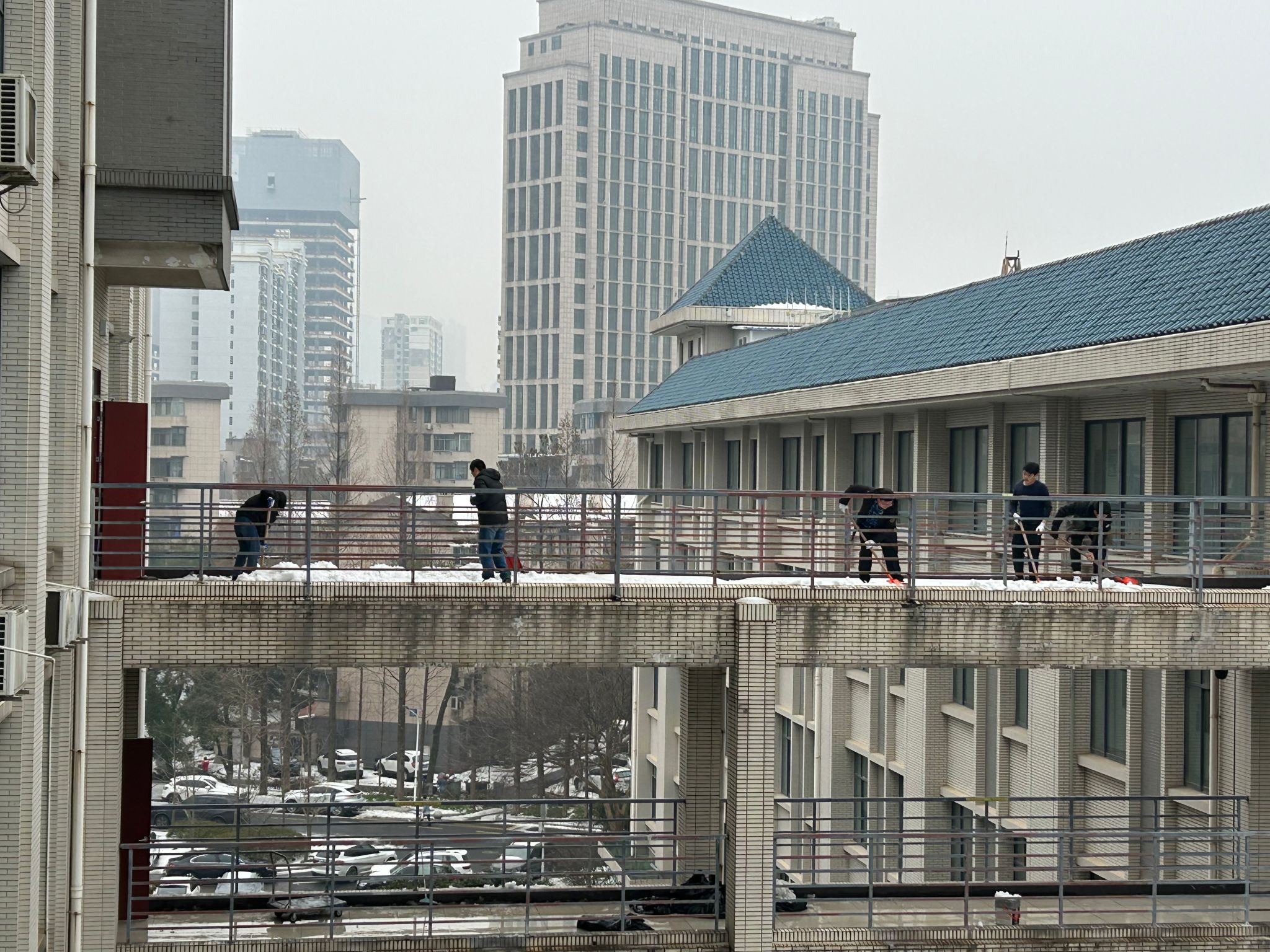 大楼中庭、连廊及学院通往桂园食堂人行道的积雪和冰层进行了集中清理。尽管厚重坚硬的冰块使清扫过程异常艰辛,但大家却热情高涨、干劲十足。