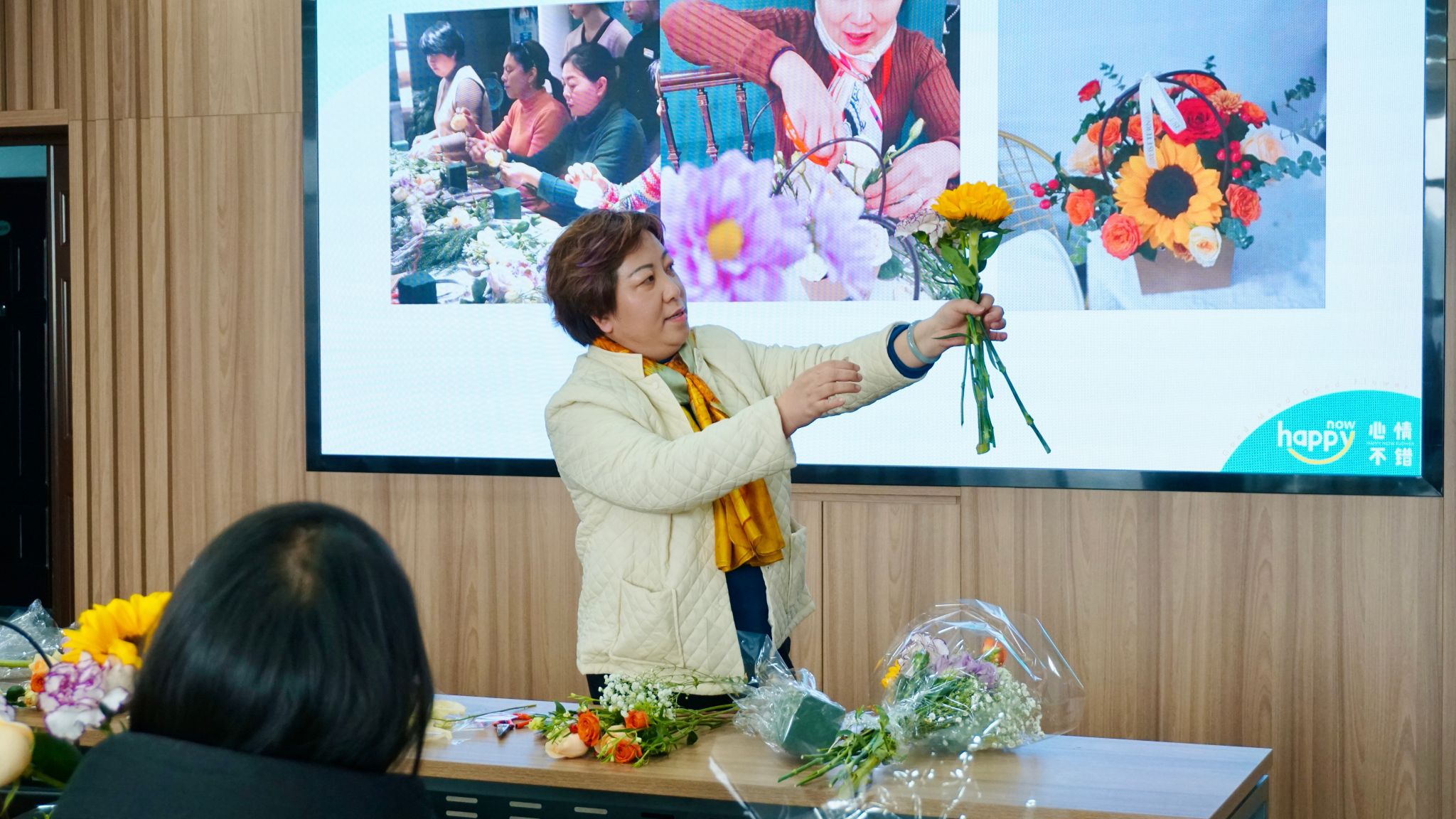 高级花艺讲师、国际压花协会高级讲师冯莉老师受邀来到活动现场,为大家讲解插花艺术的基础知识、插花造型、摆放距离、色彩搭配、话语寓意等内容,并同步详细展示了插花的手法与步骤。