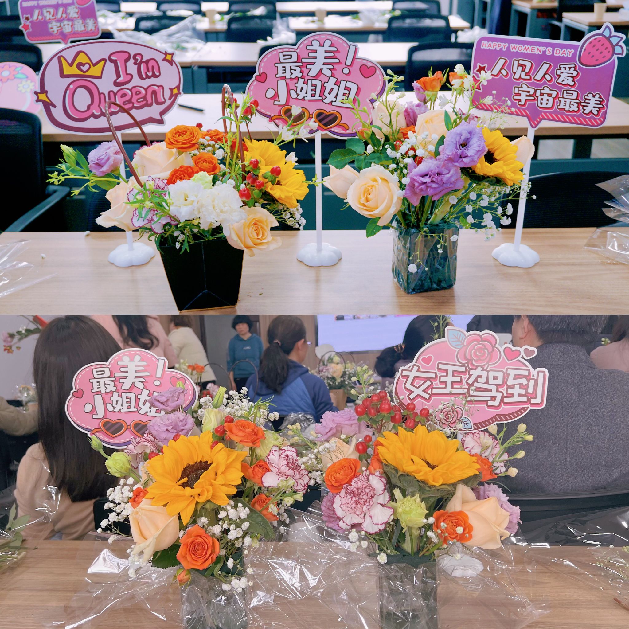 本次插花活动,不仅为女教职工科普了插花技艺的相关知识,促进了广大教职工艺术审美情趣的提升,也增进了同事之间的相互交流,拉近了大家之间的情感距离。同时,一束束美丽的插花作品也传递了美好的祝福,增强了大家的幸福感与获得感。