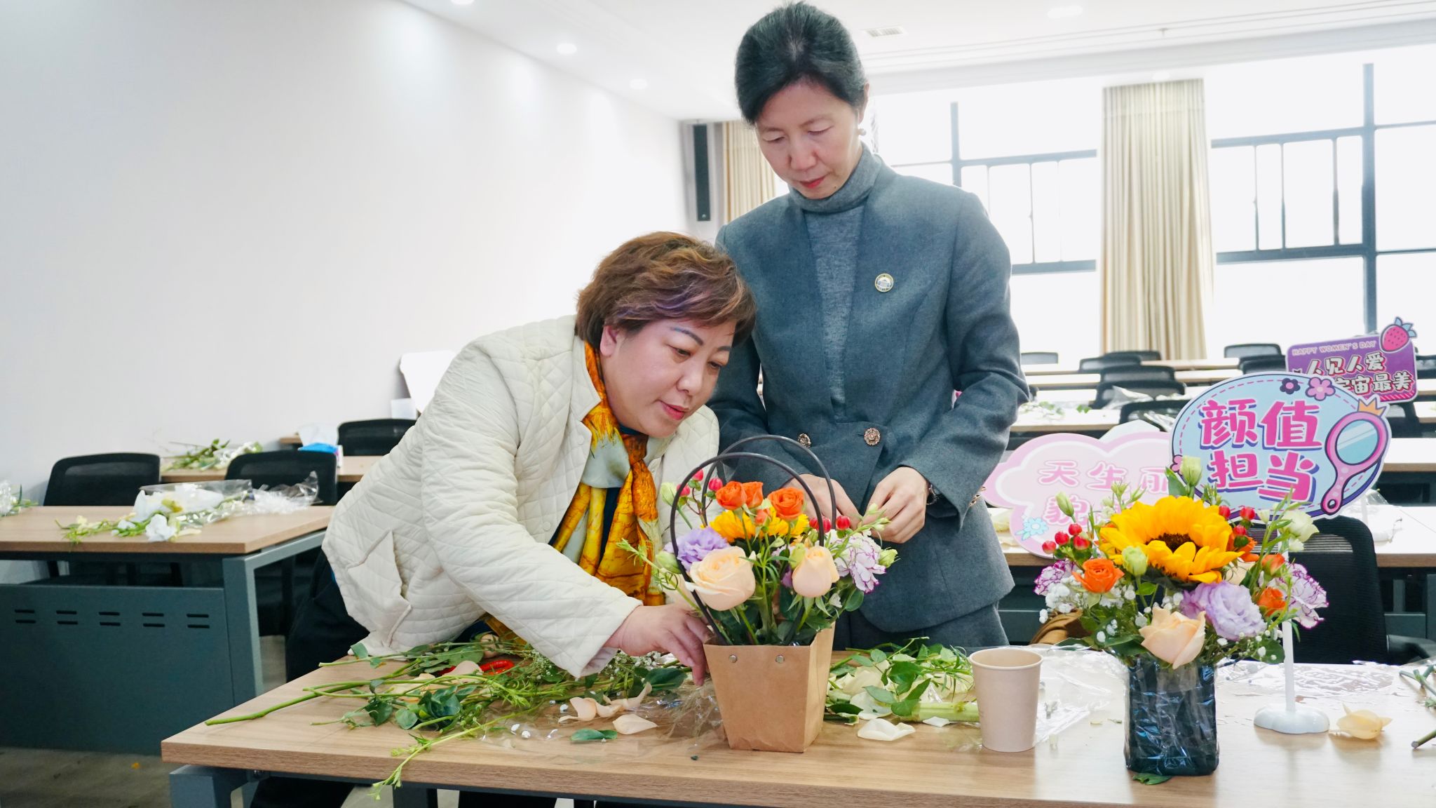 在B404组织开展了“插花拾趣、乐享生活” DIY插花活动,吸引了学院女教职工的踊跃参与。