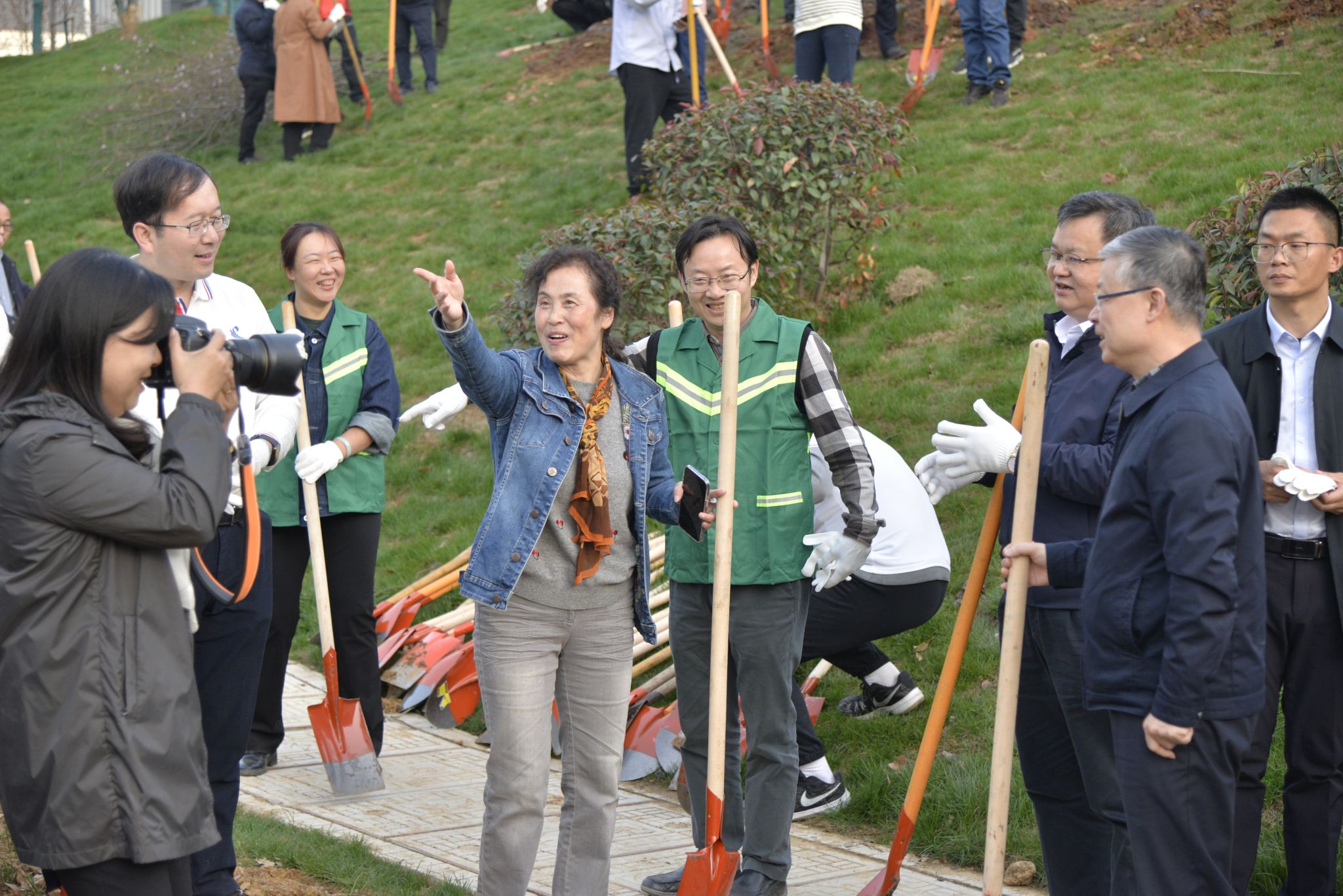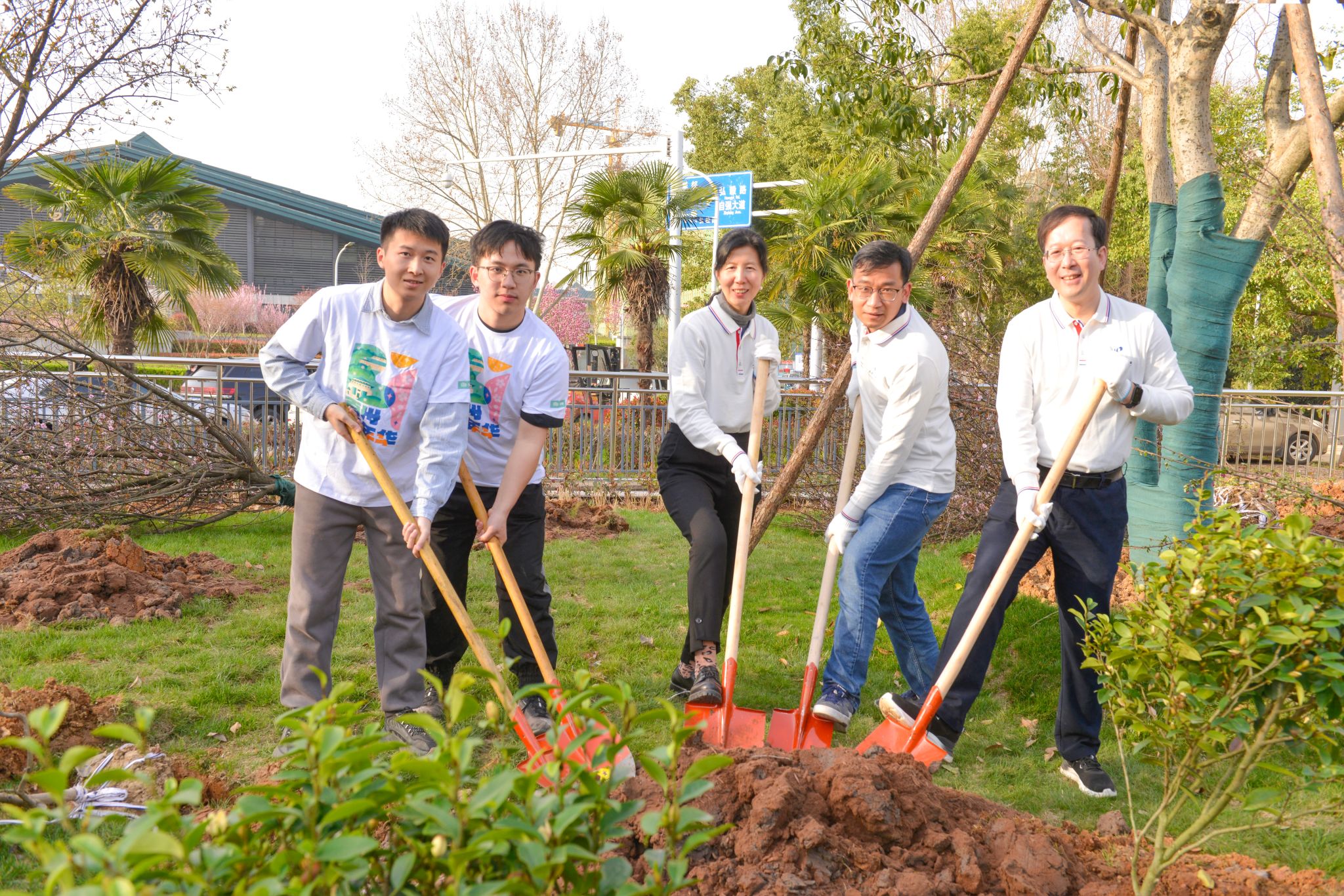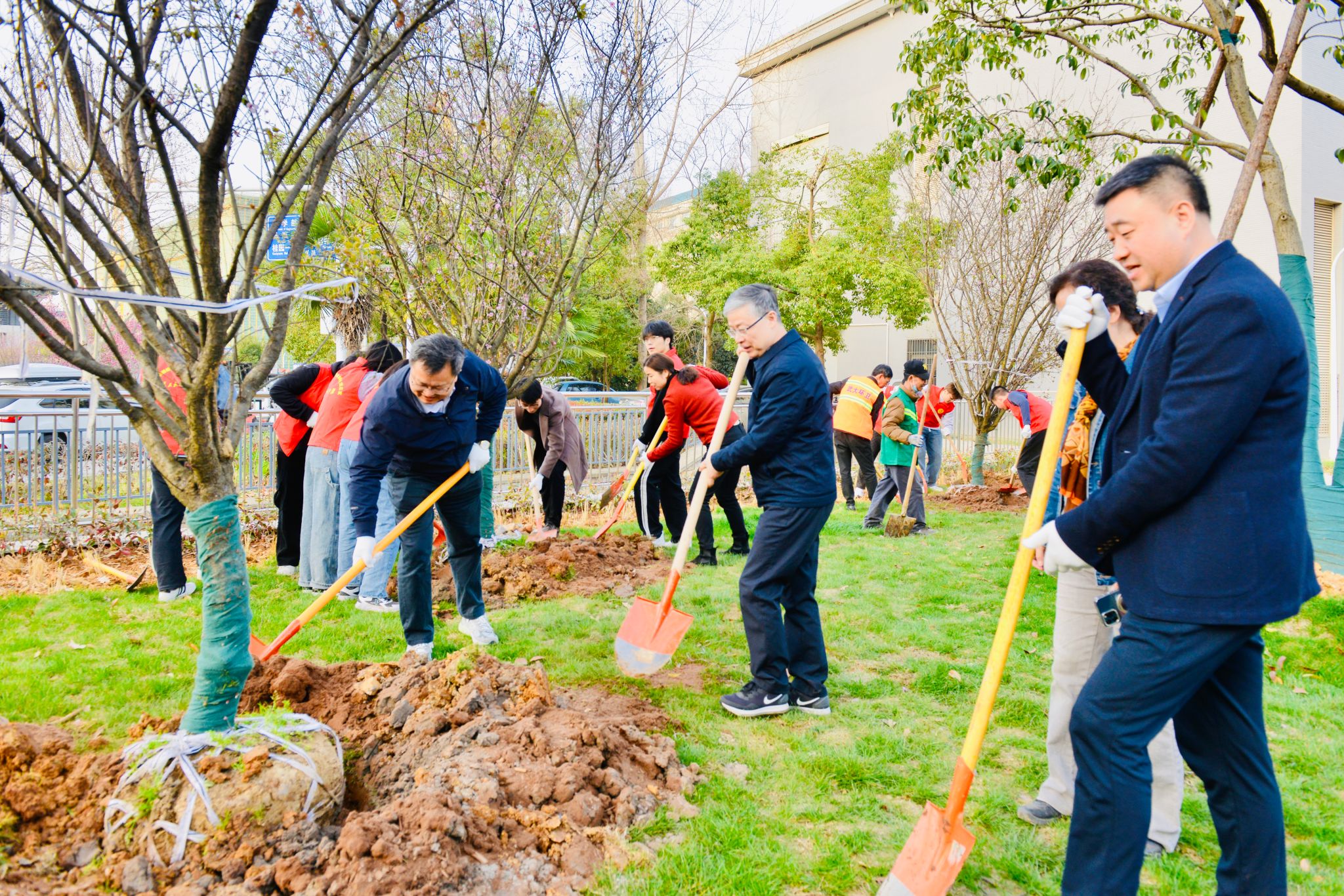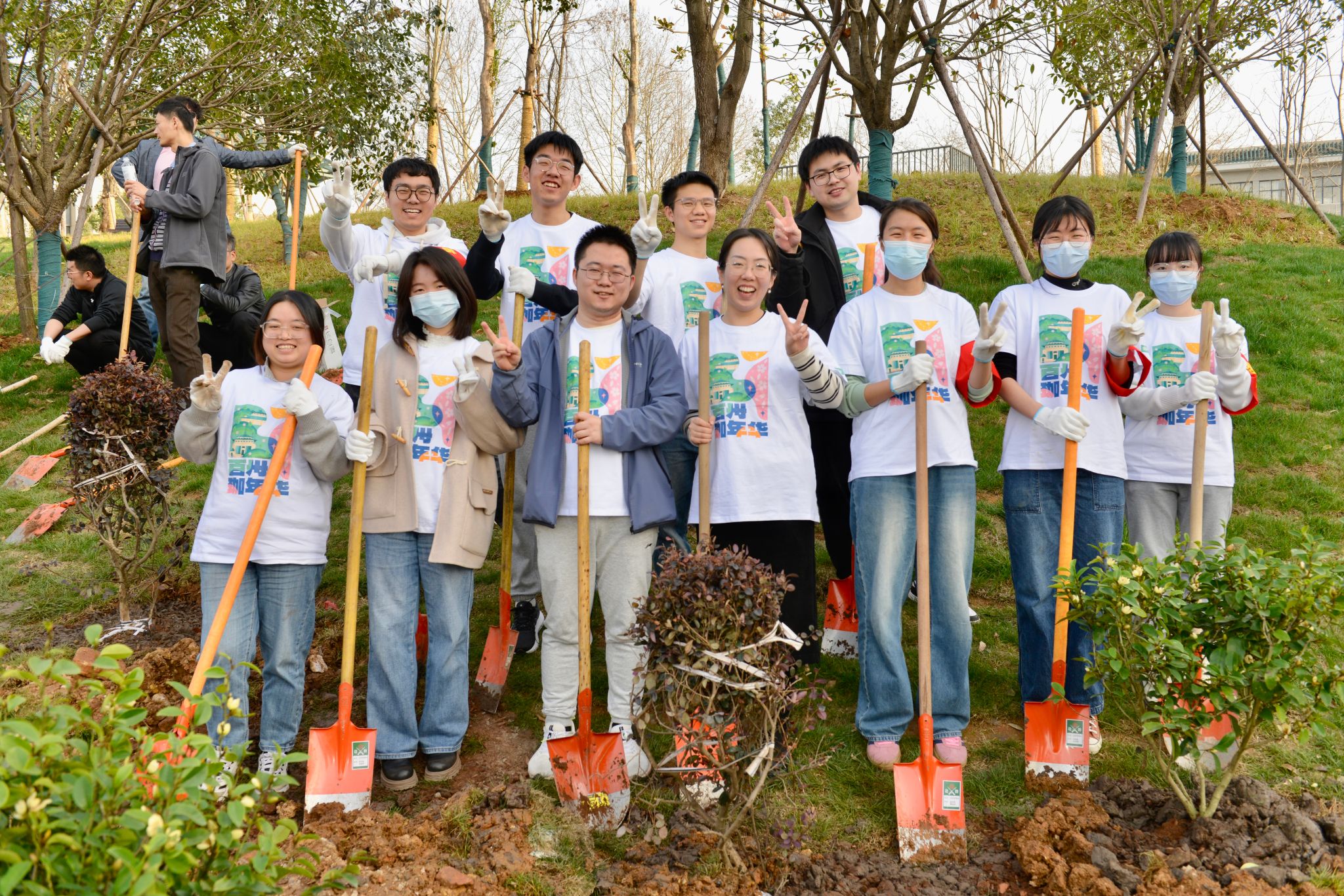 党委书记边金鸾、院长杜博,研究生辅导员史然,钟起煌、黄文柯等二十六名研究生志愿者,以及来自资源与环境科学学院和测绘学院的师生志愿者共同参加植树活动,为校园增添新绿。