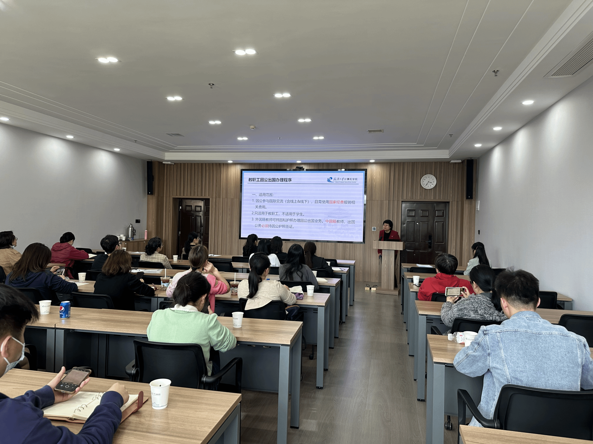 屈鹏就人事制度政策、各类行政业务办理流程进行了宣讲,孙琳、邹瑶分别对外事政策、教师因公出国出境办理流程、项目申报注意事项等方面作了详细介绍。