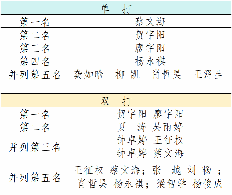 经过激烈角逐,最终比赛结果如下: