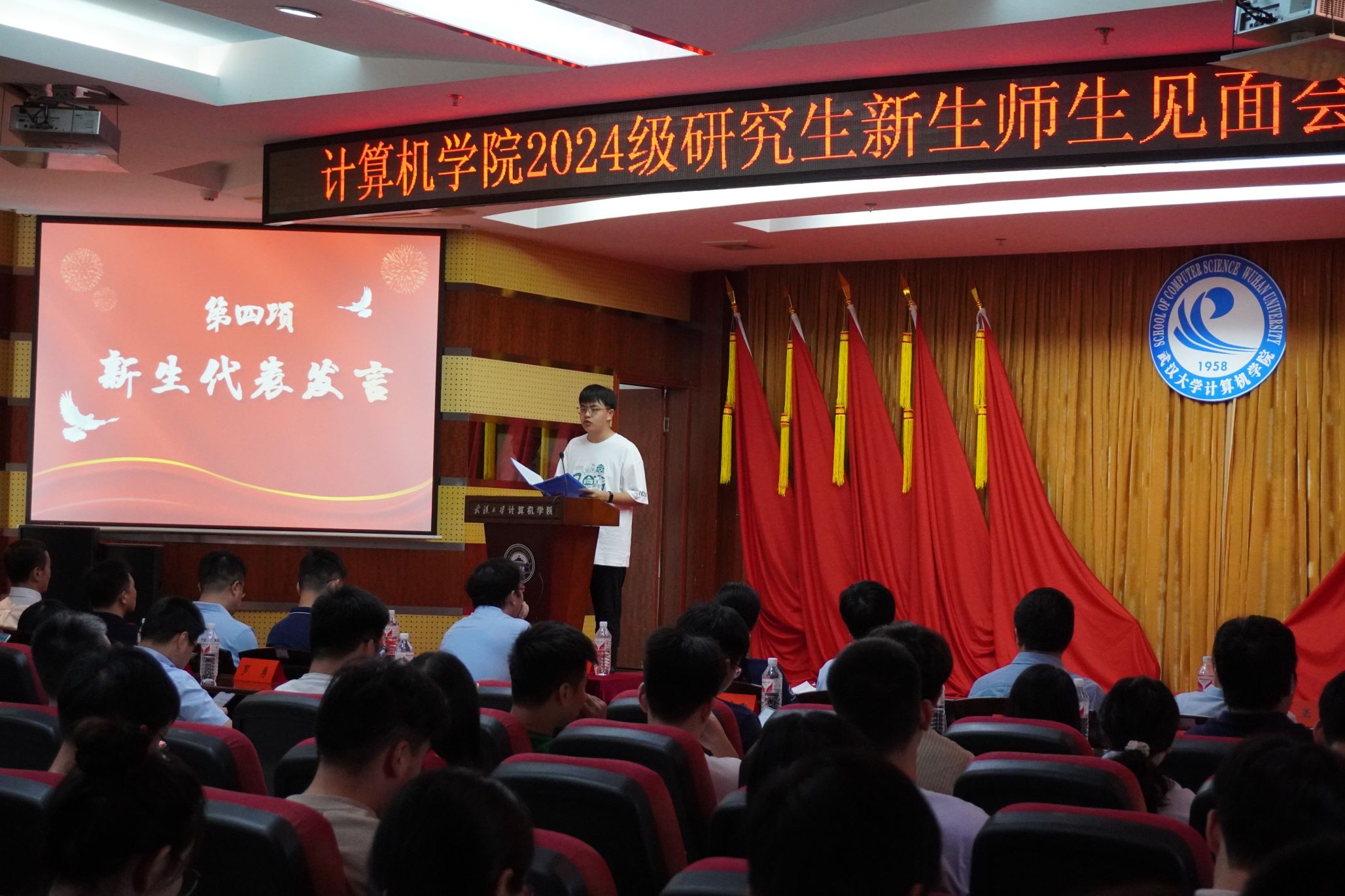 随后,2024级硕士7班桑宇泽同学代表新生发表感言。首先他表示,老师们的谆谆教诲和学长学姐们的勉励赠言,使他收获颇丰又倍感振奋。此外,桑宇泽表示,在研究生阶段不仅要深入掌握专业知识,还要在学习过程中培养独立思考和主动探索的能力。道阻且长,行则将至,行而不辍,未来可期。他号召大家要牢记嘱托,感恩奋进,在新的起点扬帆起航,在科研路上接续奋斗,在强国路上砥砺前行,在新时代新征程上展现武大人自信自强、刚健有为的精神风貌,为中华民族的伟大复兴作出青年人新的更大贡献!