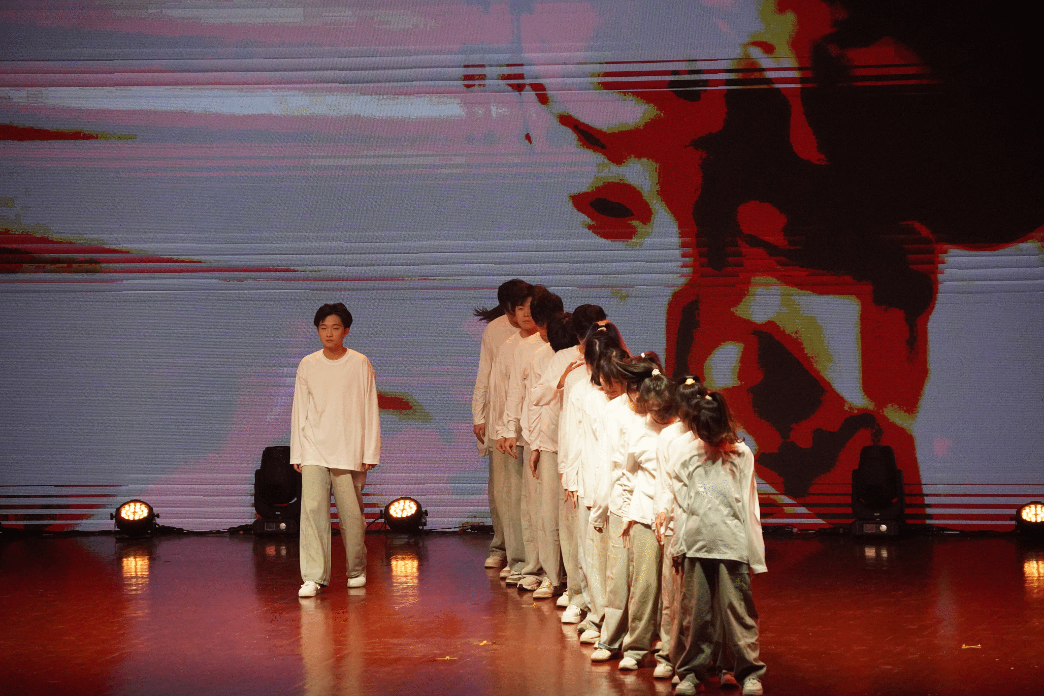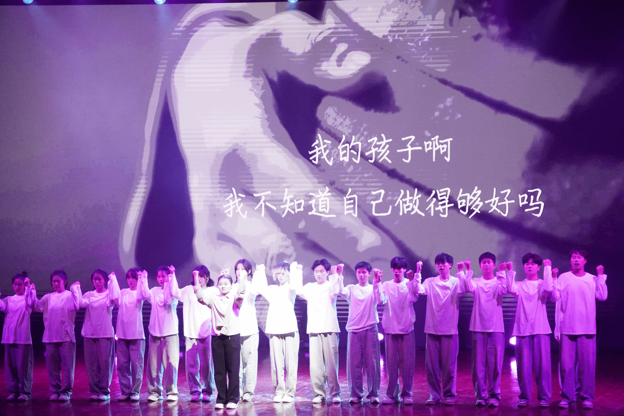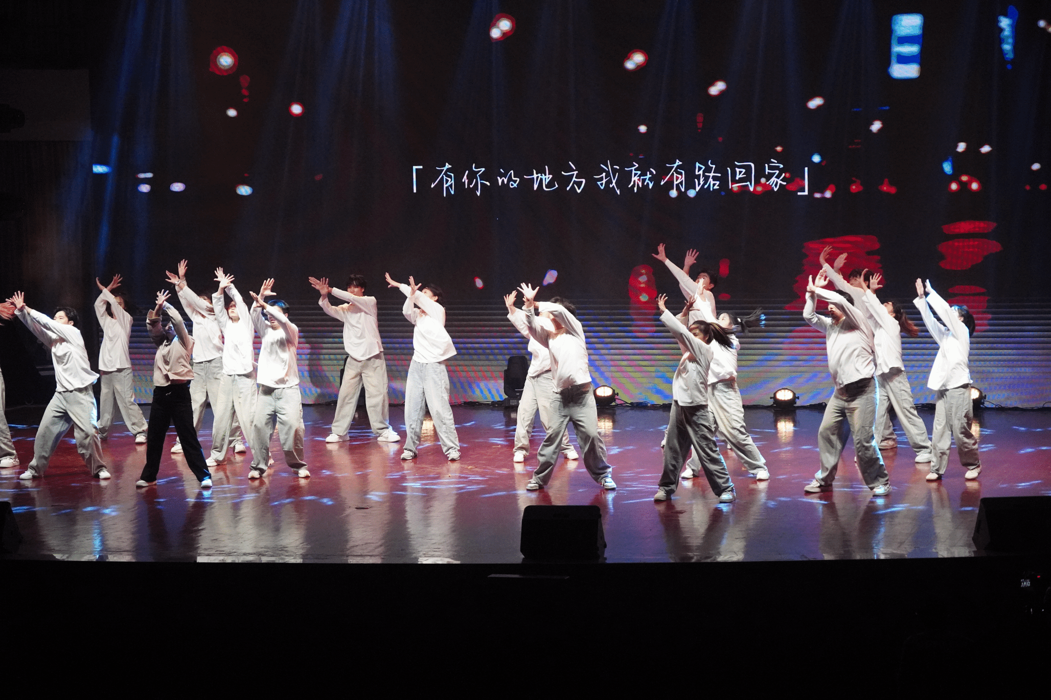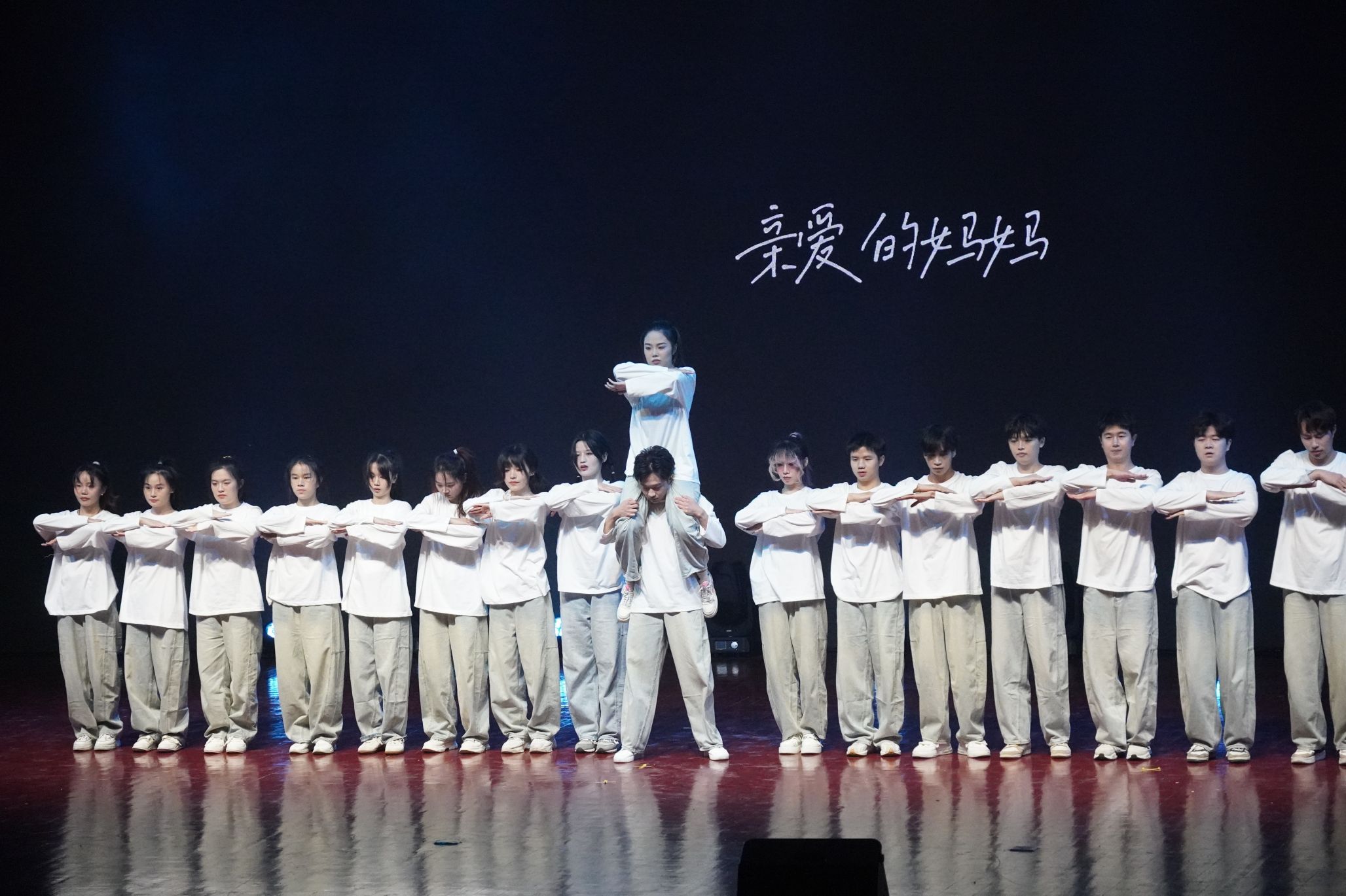 到了上台的时候,这时我们大家都已经非常熟悉了,我们的动作也打磨的很好了,这时的我们已经是一个真正的整体,所以我们已经不害怕、不紧张,因为我们知道旁边是最好的朋友,身后是最可靠的家人,心中想的是最爱的妈妈。我们的心跳是同步的,我们的眼神是坚定的。每一次转身,每一次跳跃,都是我们共同呼吸的证明。随着音乐的最后一个音符缓缓落下,我们的动作在此定格,这是我们呈现给自己和大家的最伟大的作品!