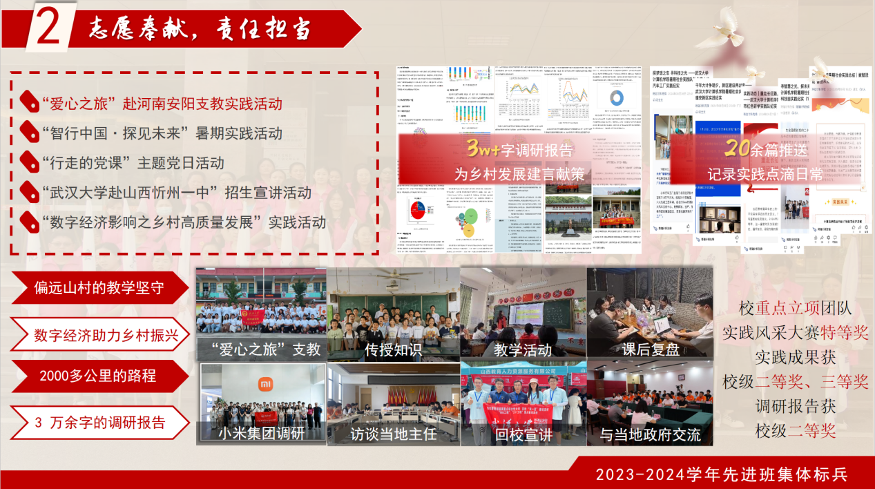 同时,班级同学积极参与社会实践和志愿服务。软工8班年度志愿服务时长达到367小时,班级同学参与“爱心之旅”支教实践、“数字经济影响之乡村高质量发展”等活动,撰写3万多字调研报告,发表20余篇推送,实践团队获校重点立项,获实践风采大赛特等奖等荣誉。