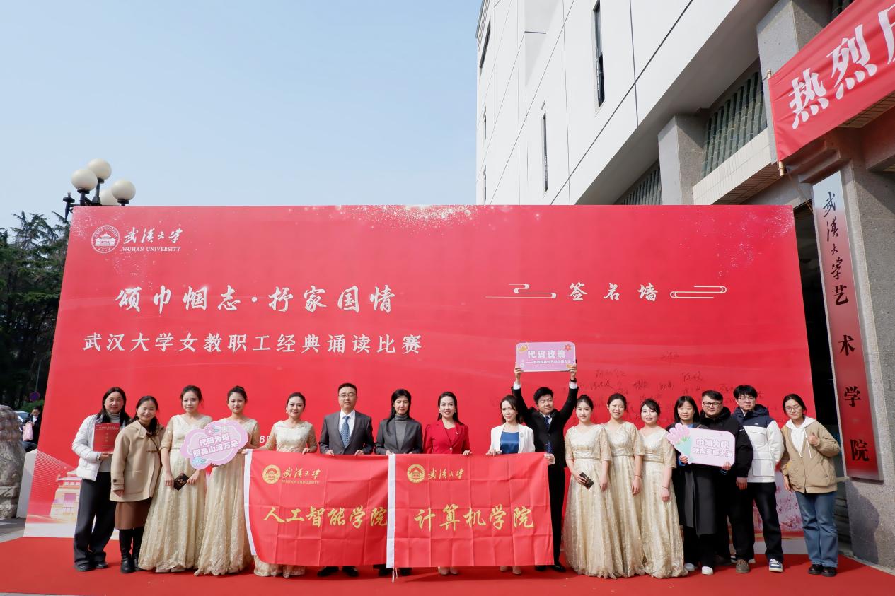 和人工智能学院代表队的老师们以昂扬的精神面貌和澎湃的激情,生动展现了两个学院的风采。朗诵节目巧妙融入了夏培肃、史宗玮和钟苏文三位计算机领域的杰出女性的事例,热情歌颂了奋战在科技战线上的女性学者。节目激励着更多武大师生牢记为习近平总书记“始终胸怀‘国之大者’,勇攀科学高峰!”的殷切嘱托,努力为实现高水平科技自立自强作出新的更大贡献。舞台上,老师们配合默契,以饱满的情感朗诵出每一个字句,舞台走位流畅自然,机器狗的配合更是灵动十足,赢得台下观众阵阵热烈的掌声。