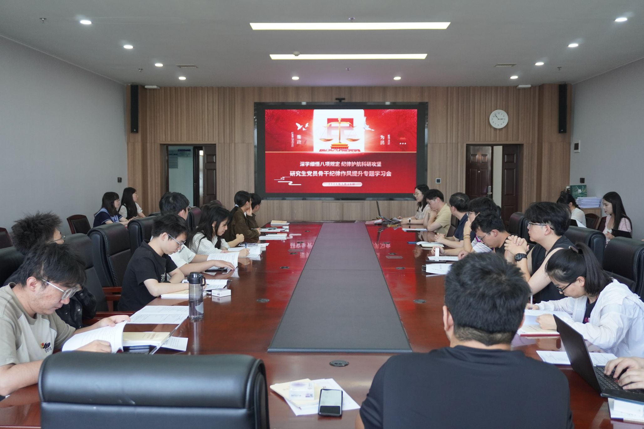 2025年作风建设册》,系统阐释中央八项规定精神的理论内核与实践要求,并强调要始终一以贯之地坚持廉洁自律和优良作风。在领学过程中,史老师还结合科研经费使用、违规收受礼品、虚报经费、公款旅游、学术不端等多个维度的实际案例向大家全面细致地讲解了生活中违反中央八项规定精神的典型案例,警示同学们要引以为戒,珍惜学术生命,恪守学术诚信底线。