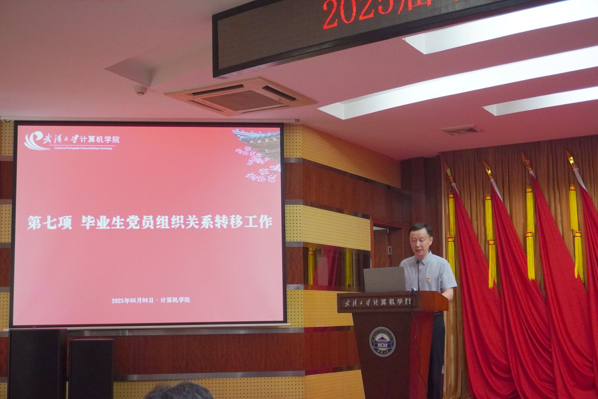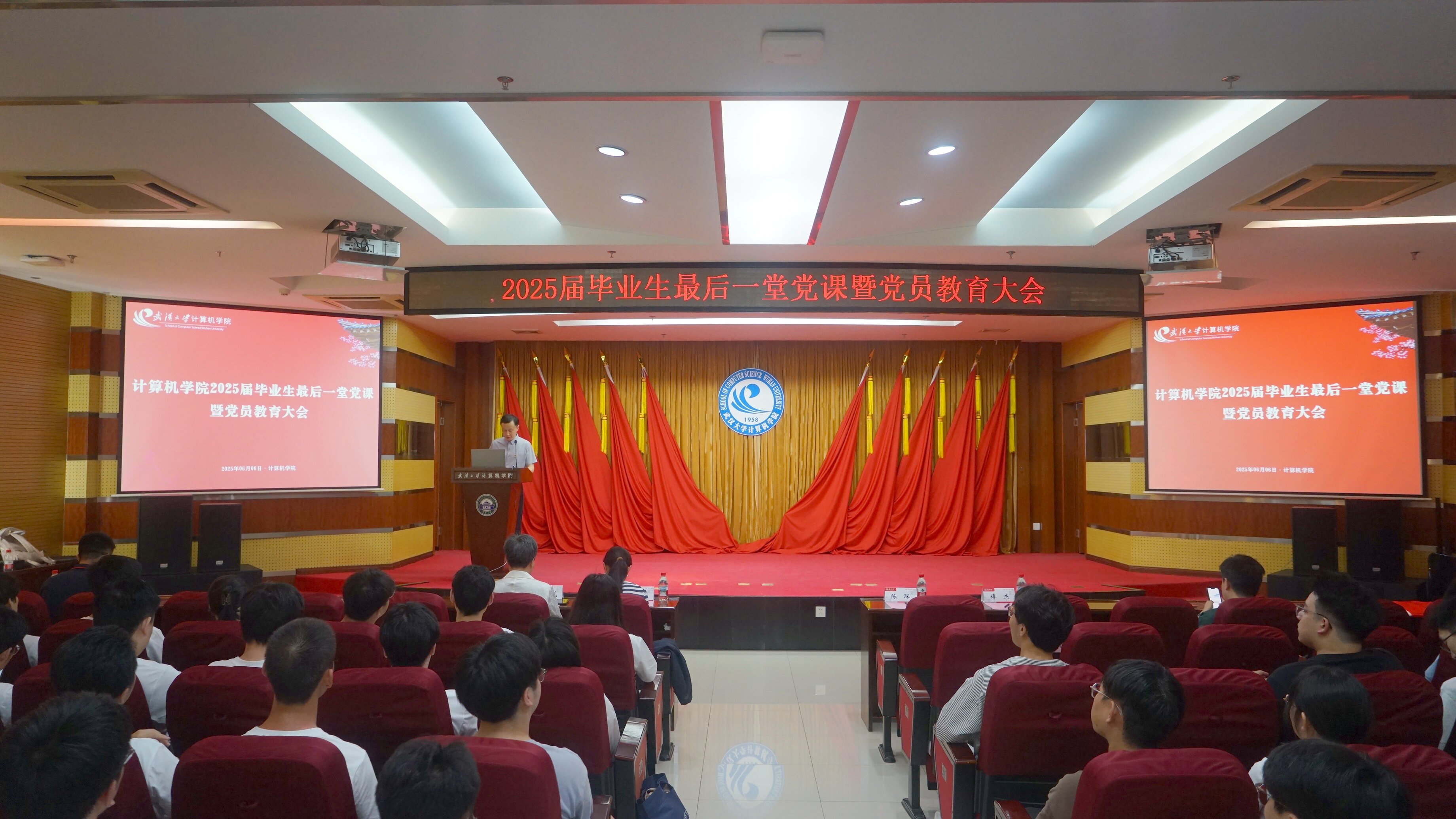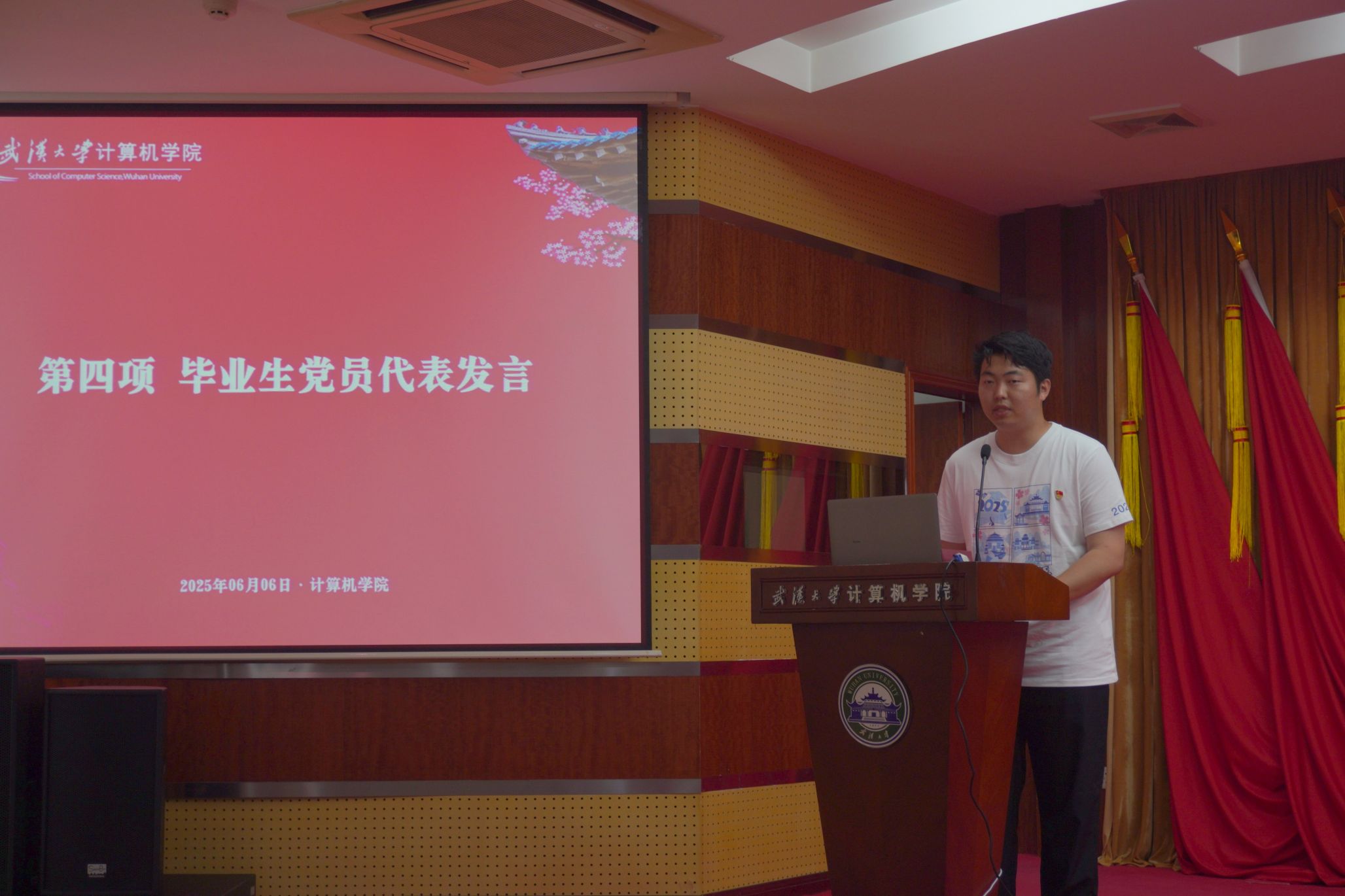 珞珈青年回响,火种照亮前路。优秀毕业生代表2021级本科生党员胡成超分享成长体悟:“从乡村振兴中编写‘智慧农业’系统,到科研一线攻坚AI芯片,党员身份是永不掉线的‘操作系统’。”他号召广大计科学子以雷军学长“学会学习”为鉴,凭“关关难过关关过”的韧性,践行“强国有我”的青春誓言。