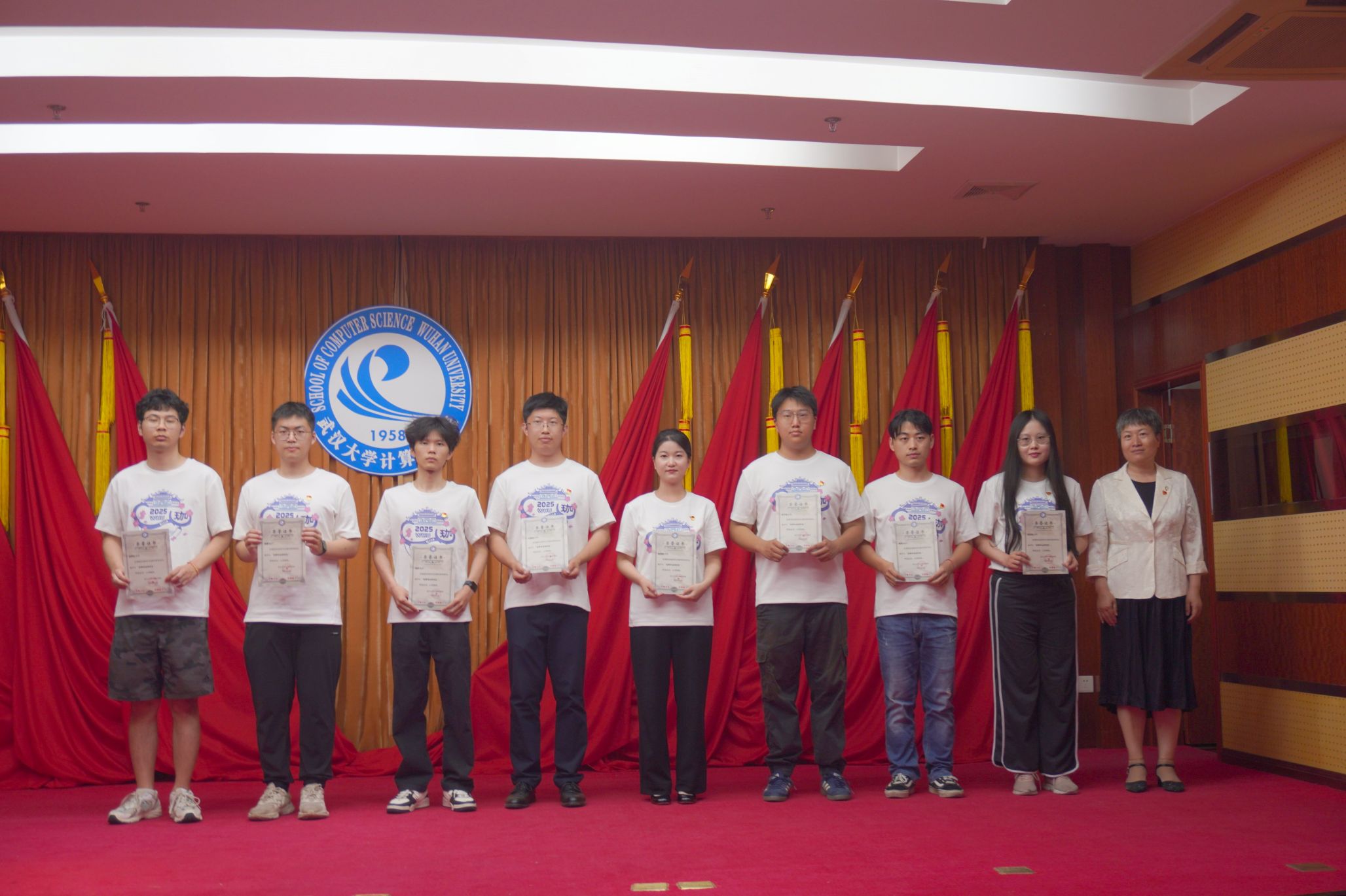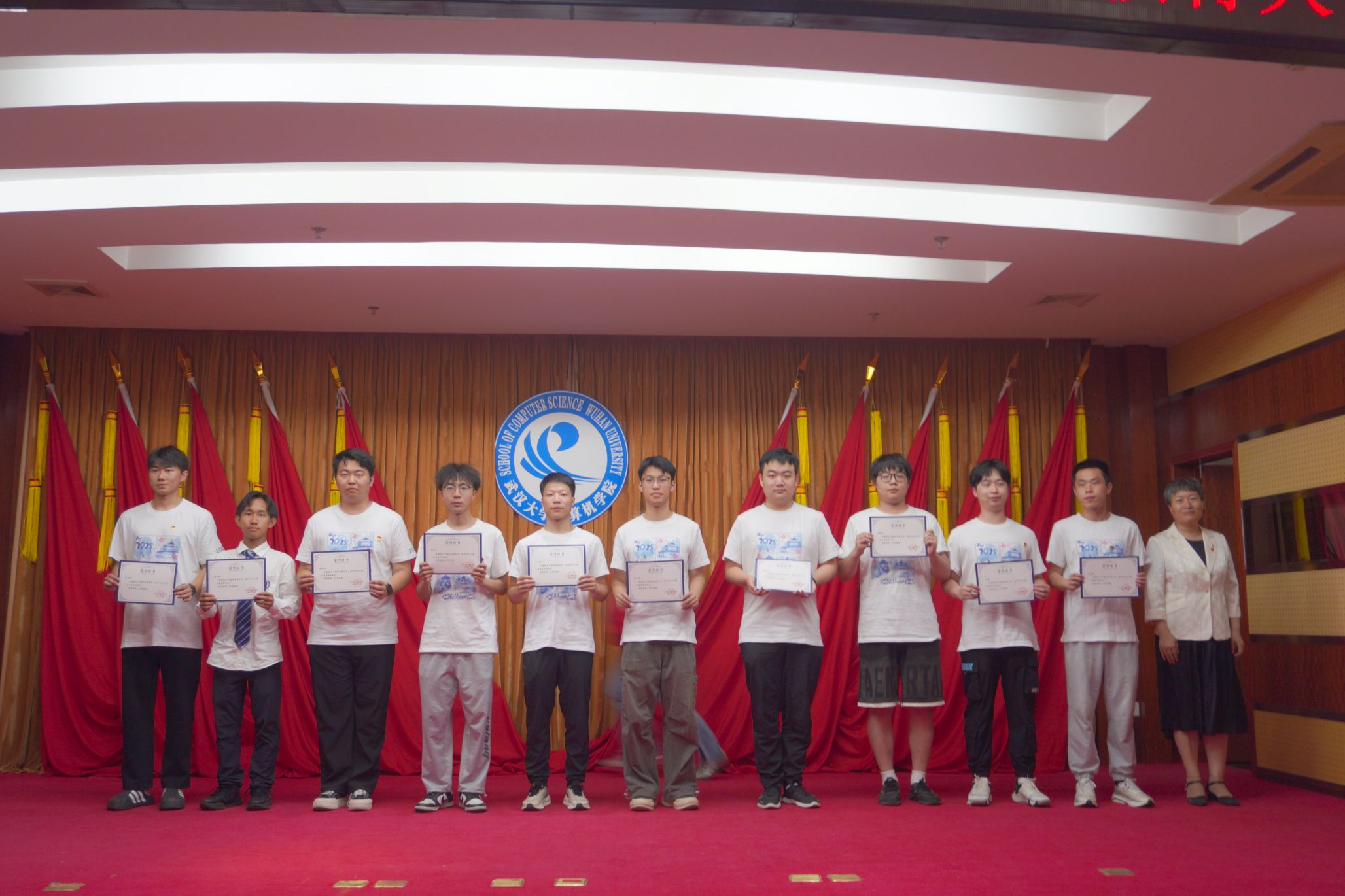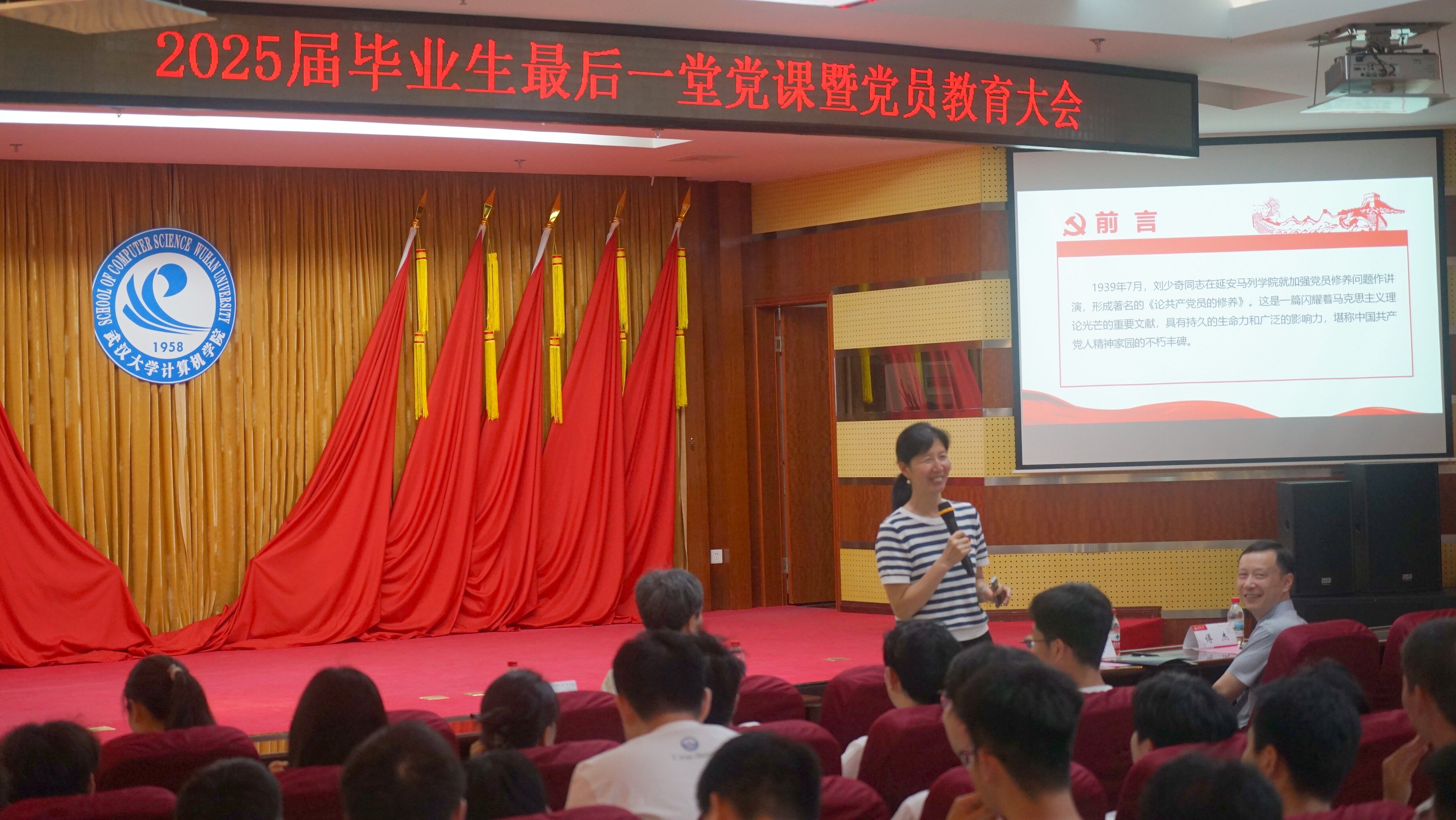 珞珈青年回响,火种照亮前路。优秀毕业生代表2021级本科生党员胡成超分享成长体悟:“从乡村振兴中编写‘智慧农业’系统,到科研一线攻坚AI芯片,党员身份是永不掉线的‘操作系统’。”他号召广大计科学子以雷军学长“学会学习”为鉴,凭“关关难过关关过”的韧性,践行“强国有我”的青春誓言。