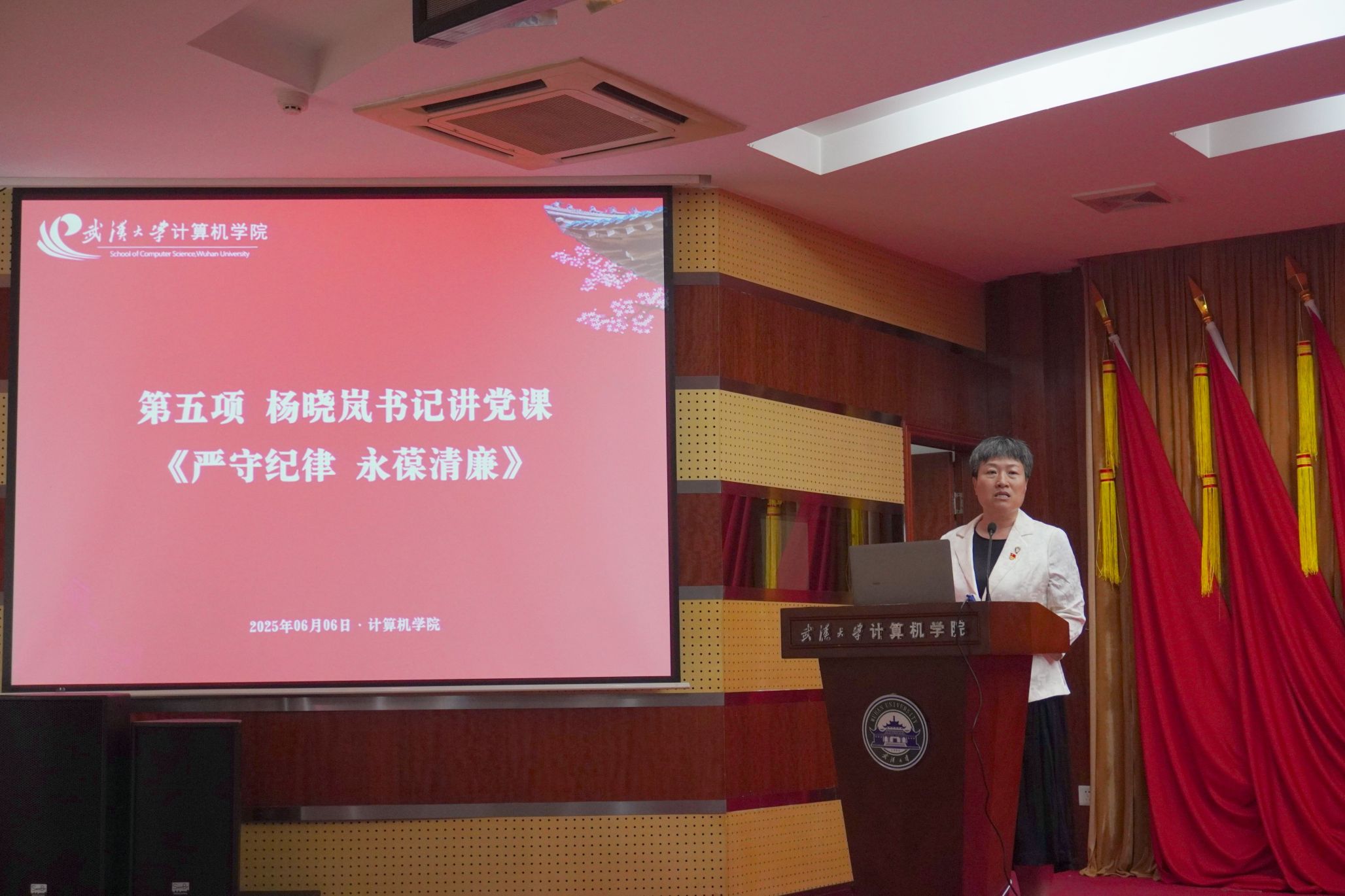 杨晓岚老师以《严守纪律 永葆清廉》为题,结合身边事例敲响党纪警钟,她提出三重行动指南:懂法纪、明规矩——入职先读“说明书”,党纪国法即党员行为准则;知敬畏、存戒惧——莫信“伸手未必被捉”,信息化时代违纪行为无所遁形;行得正、走得稳——算清政治账、自由账、名誉账等人生七笔账。她强调纪律是人生“安全阀”,叮嘱毕业生党员永葆清正本色。