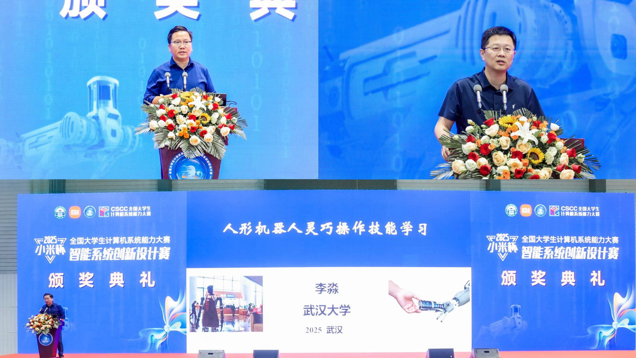 机器人学院李淼教授受邀出席了颁奖典礼,并作题为“人形机器人灵巧操作技能学习”的报告。最后,在全国大学生计算机系统能力大赛组委会主任、北京航空航天大学高小鹏教授的寄语下,颁奖典礼落下帷幕。