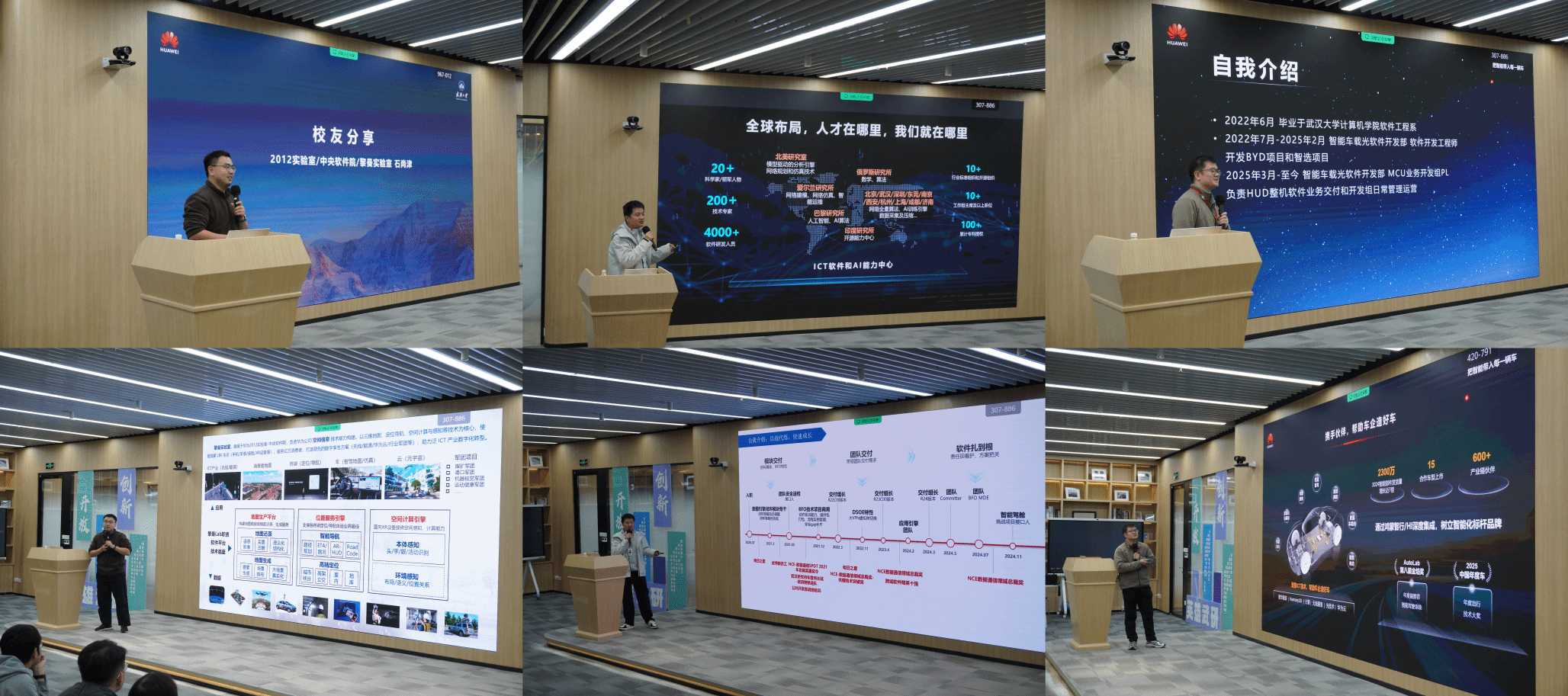 随后,来自黎曼实验室、共公开发部、智能汽车解决方案BU的技术专家、校友代表石尚津、李学礼、胡胜康围绕自身在公司的成长轨迹与技术实践,分享了华为在AI、软件开发、智能驾驶等不同领域的业务开展情况,并分享了不同岗位的职责与能力模型,给同学们的职业规划提供了参考与借鉴。