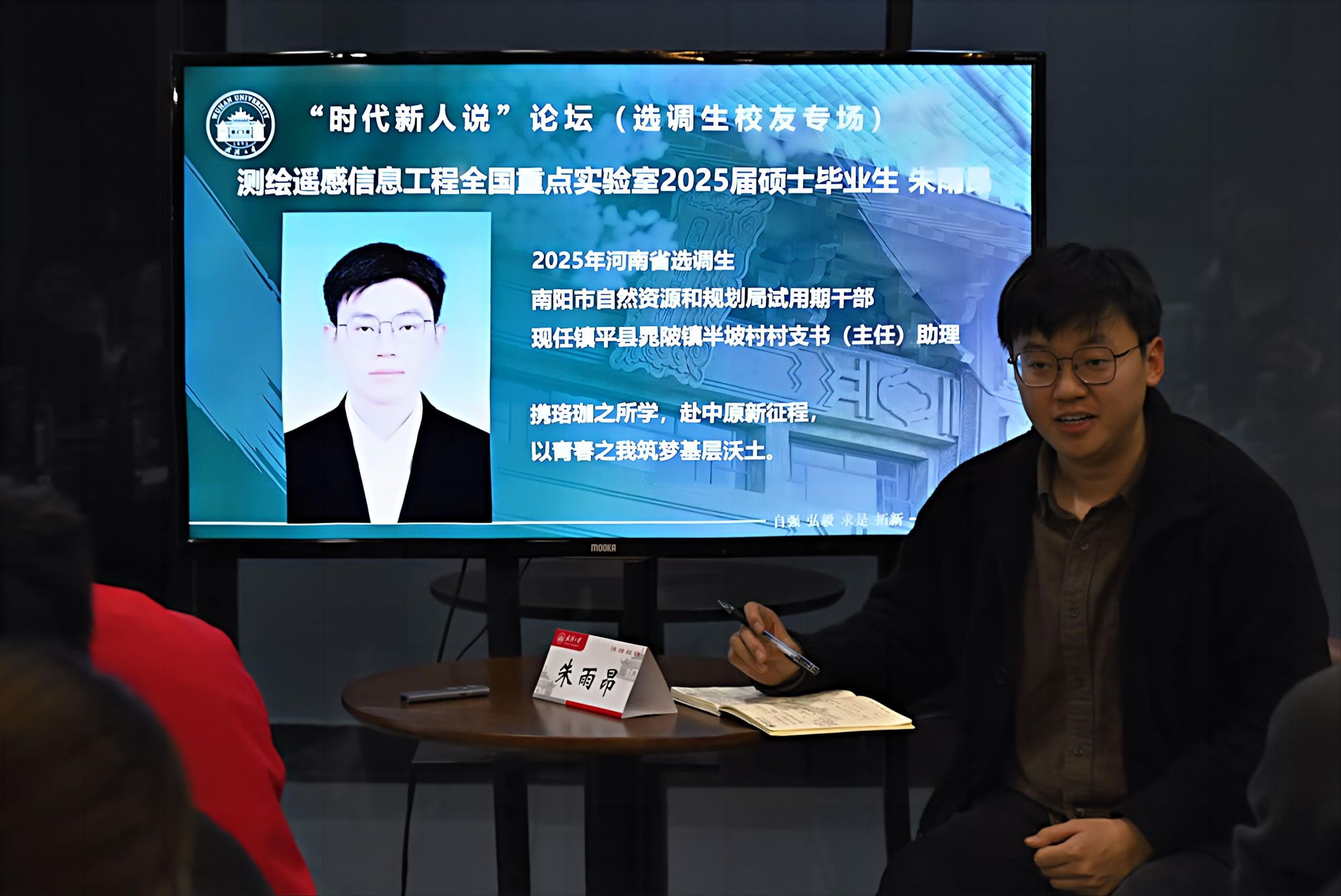 2020届毕业生李文杰;河南省南阳市镇平县晁陂镇半坡村村支书(主任)助理,测绘遥感信息工程全国重点实验室2025届毕业生朱雨昂。从江西吉安的乡镇治理,到重庆綦江的组织人事,再到河南南阳的驻村助理,他们以不同视角讲述了青年干部在新时代基层治理中的责任、奋斗与成长。