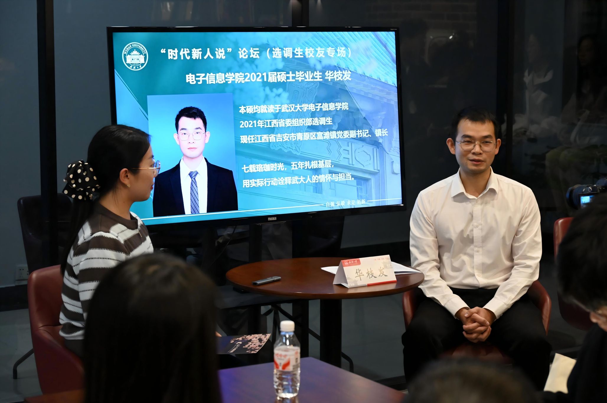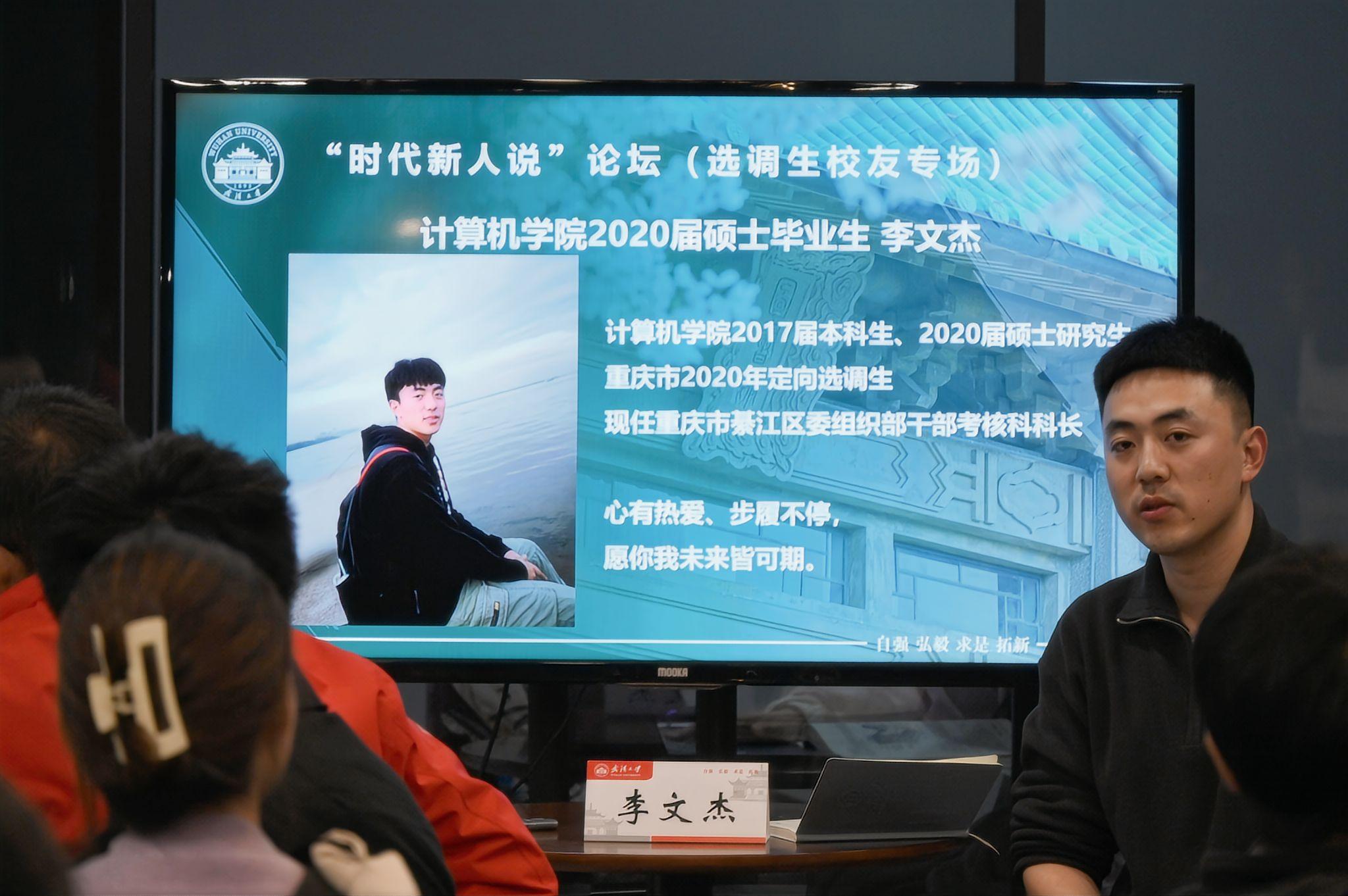 研究生辅导员史然老师作为主持人,介绍了三位选调生校友的求学经历与工作背景。他们分别是江西省吉安市青原区富滩镇党委副书记、镇长,电子信息学院2021届毕业生华枝发;重庆市綦江区委组织部干部考核科科长,Avidol