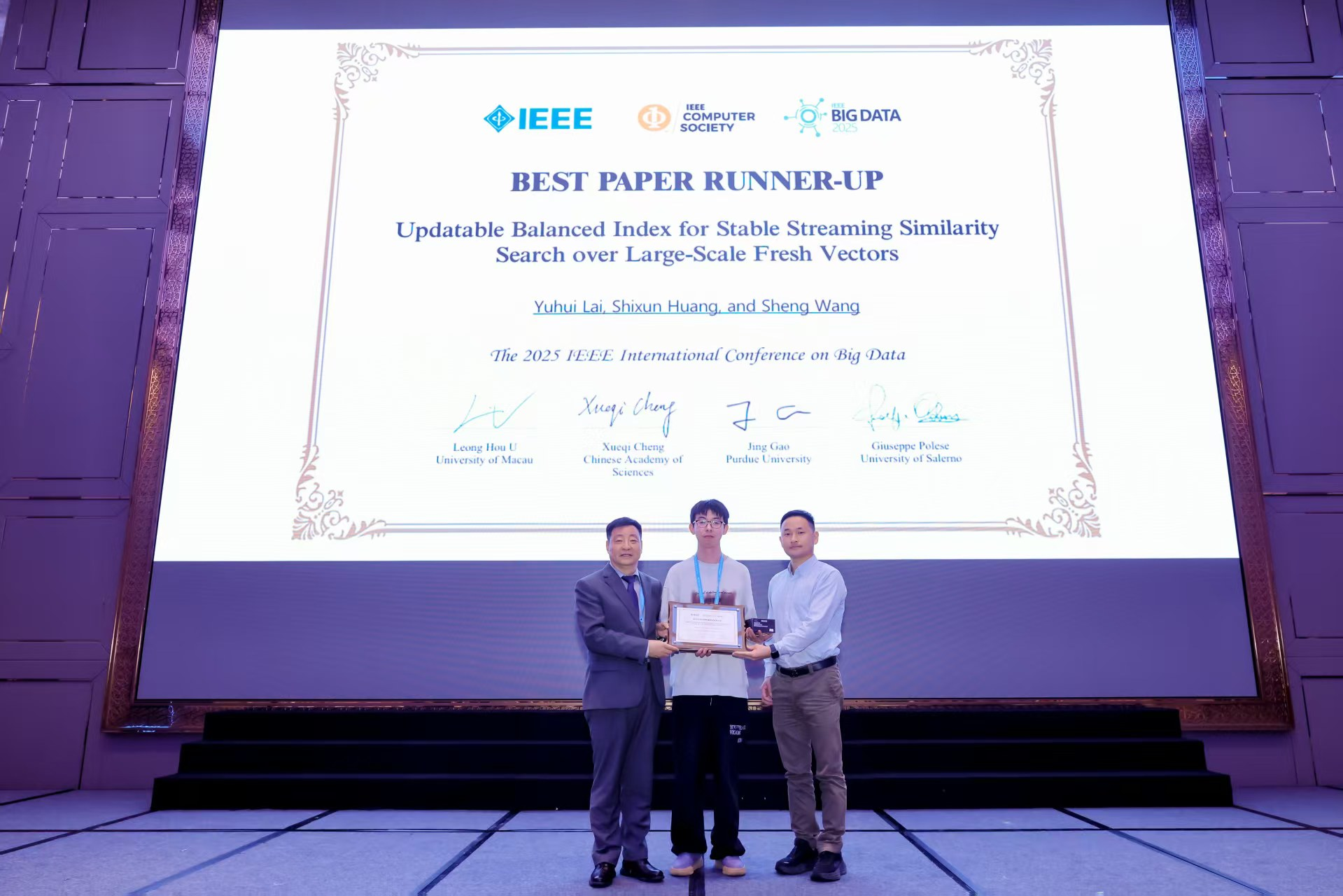 王胜教授。获奖论文题目为《Updatable Balanced Index for Stable Streaming Similarity Search over Large-Scale Fresh Vectors》,该论文从140篇录用的长文中被选为唯一的最佳论文亚军奖。