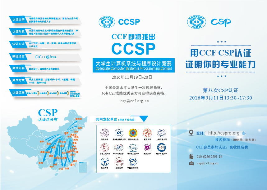 7、作弊处理:认证现场除了有监考老师巡视外,CCF会派巡视员抽查各认证点。为发现CSP认证中的作弊现象,在评测过程中,CCF CSP技术委员会将采用两两比对的方法,对所有参加认证者的源程序进行比对,如发现源程序存在相似或雷同现象,将取消成绩并公示;如果认证点有任何作弊、抄袭等行为,认证点监考人员没有及时制止并给予处罚,将取缔所在高校认证点并在CCF官网公布。
