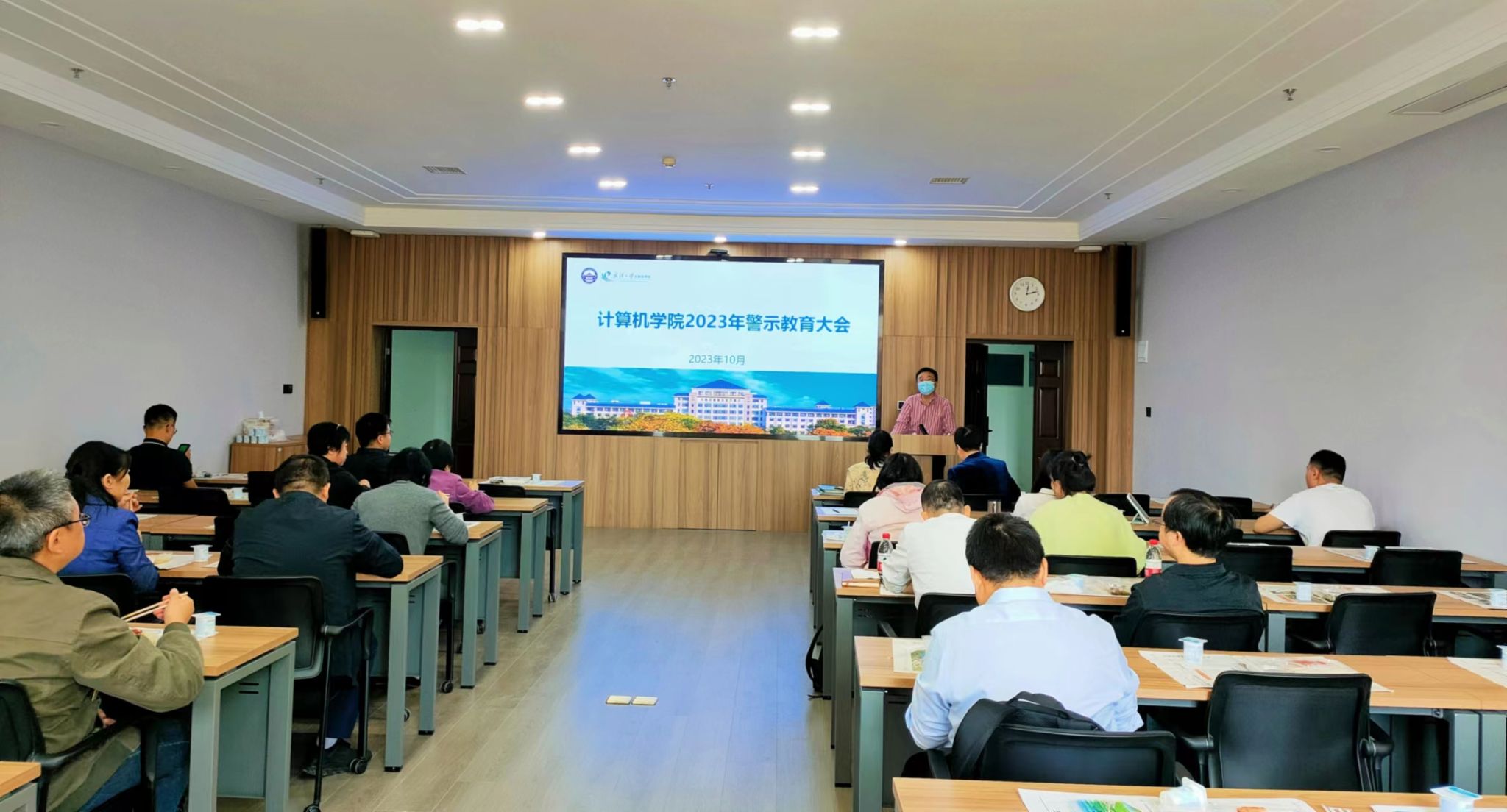 在B404会议室召开警示教育大会。院党委委员、院领导班子全体成员,系、所、中心主任、副主任,教工党支部支委,内设机构副主任以上干部和全体辅导员参加会议,院党委副书记高卫松主持会议。